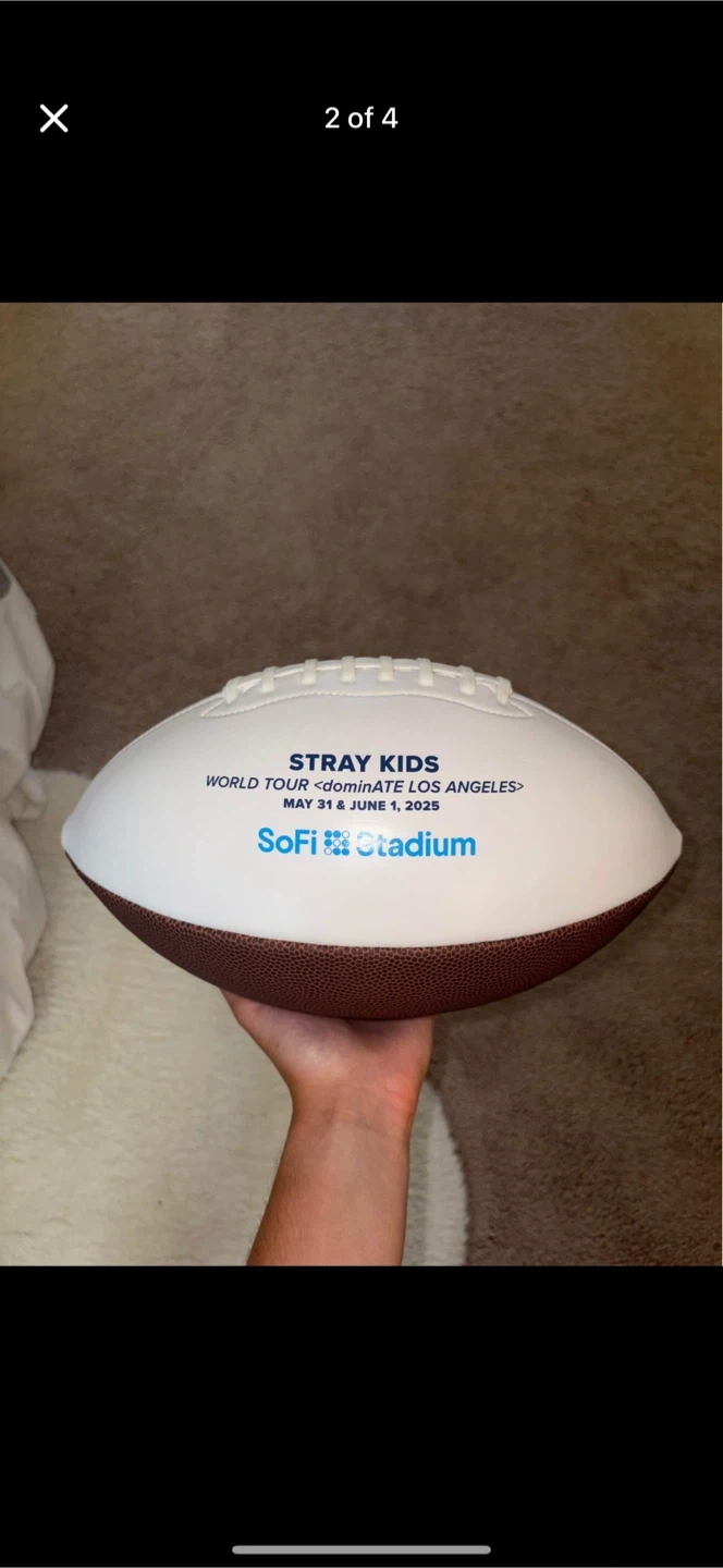 Selling a commemorative football from the Stray Kids World Tour at SoFi Stadium in Los Angeles. It's in great condition and features the SoFi Stadium logo along with the tour dates May 31-June 1, 2025. A perfect collectible for any STAY!