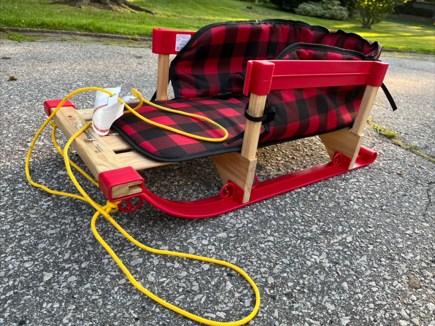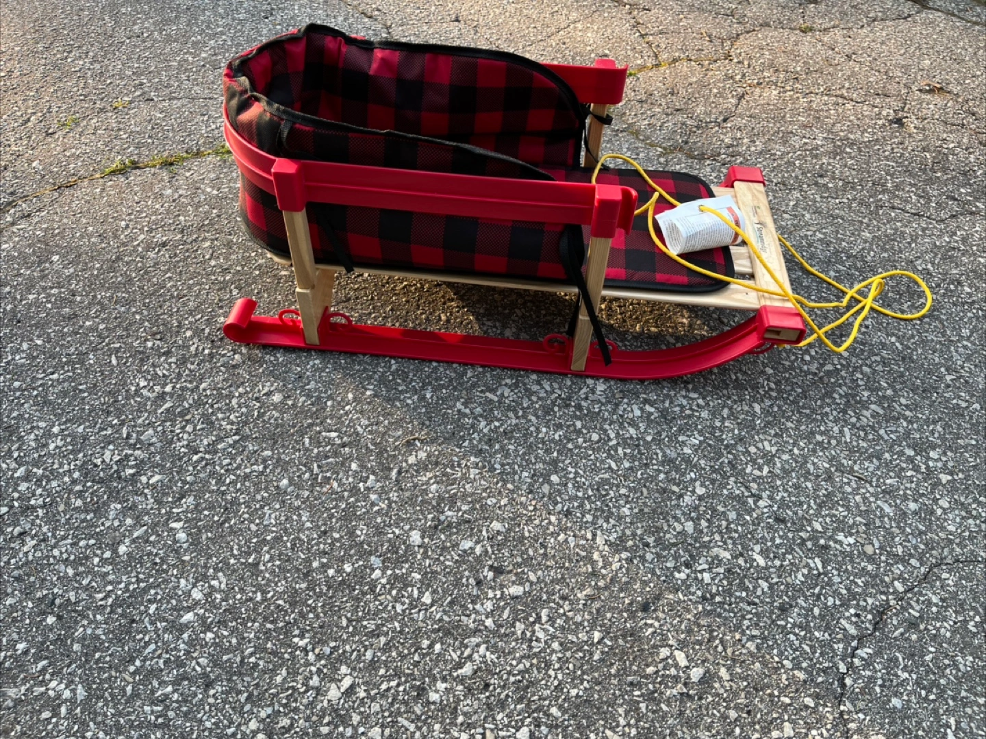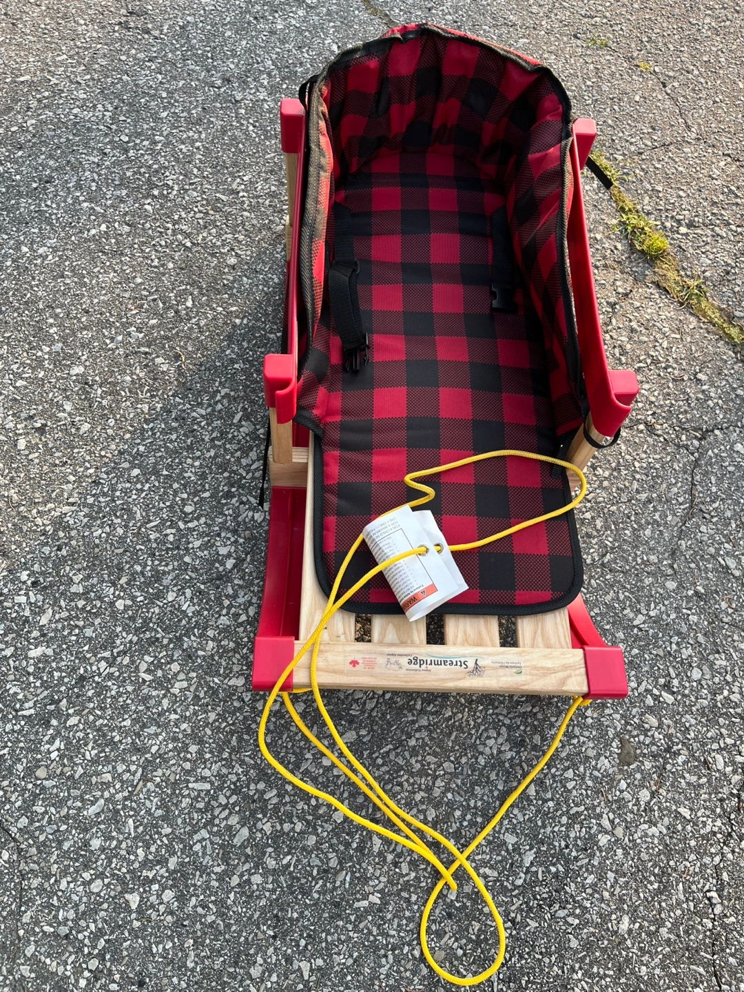 Great Christmas gift! Cozy and safe baby sleigh. Features a red frame and a comfy red and black plaid seat. Perfect for winter walks and outdoor fun with your little one. Keeps little one dryer, warmer, and sitting up. Easy to add a blanket! Used once.
