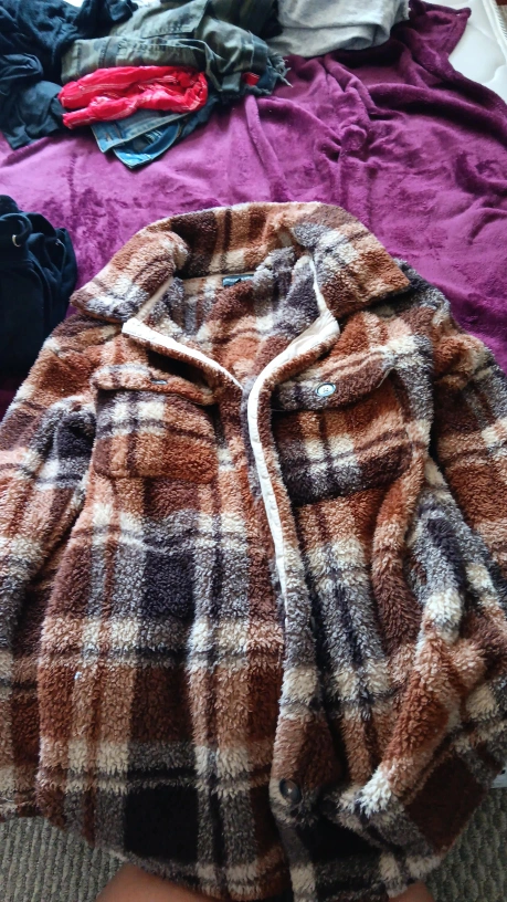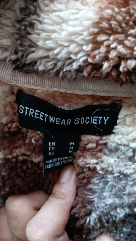 Cozy up in this Streetwear Society plaid sherpa jacket! It's a size medium and features a warm, fuzzy texture perfect for chilly days. The brown and white plaid pattern adds a classic touch to this comfortable jacket