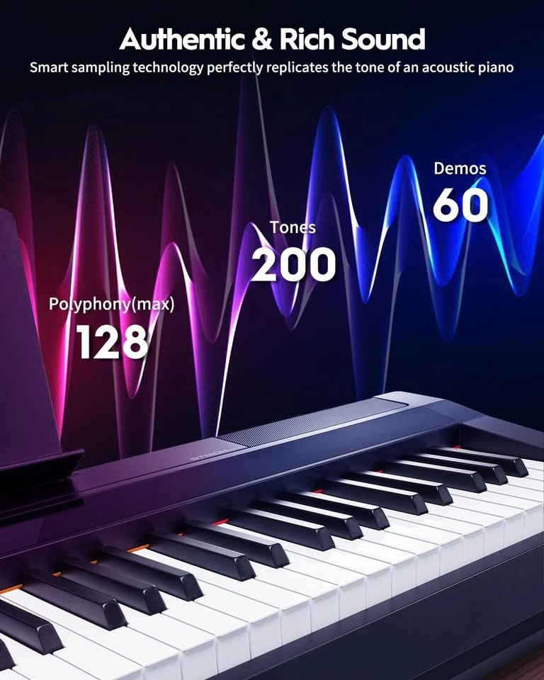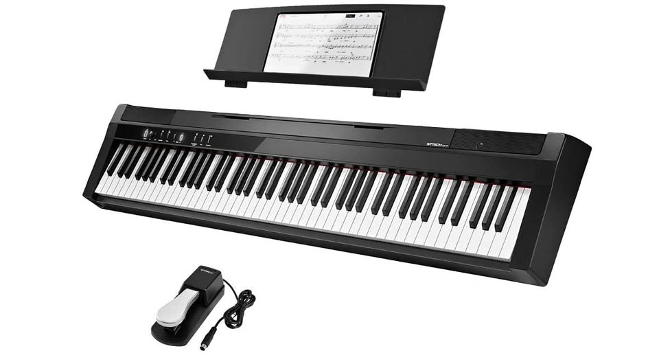 BRAND NEW IN BOX Includes Keyboard, Pedal and Music Rest Strich 88 Key Digital Piano, Full size weighted keyboard, pedal, music rest - Model: SDP-P7 This digital piano is loaded with 200 tones—letting you explore endless styles. Practice and perform with 60 demo songs, dual keyboard mode, layering, metronome, transpose, and more. Dual wireless connect allows seamless pairing with phones, tablets, or computers to stream music or transfer MIDI files. Two headphone jacks let you practice quietly anytime without disturbing others. The piano tones are sampled from renowned European German-style grand pianos, combined with Strich's exclusive multi-layer dynamic sampling technology. Equipped with dual DSP processors, it delivers lossless sound reproduction, allowing you to enjoy a more premium and authentic piano tone experience. Equipped with a professional-grade 2-way speaker setup (5W×2 tweeters + 20W×2 woofers), this digital piano delivers rich, full-spectrum audio with crystal-clear highs and deep, resonant lows. Even in small rooms, you’ll experience room-filling stereo sound that brings your music to life. This weighted keyboard piano features fully graded hammer-action keys, matching the feel and size of a real piano. Lower keys feel heavier, upper keys lighter—offering an authentic and expressive playing experience. Designed to break free from bulky traditional pianos, this hammer-action portable electric piano is lightweight and easy to move, perfect for lawn parties, street performances, or casual jam sessions with friends.