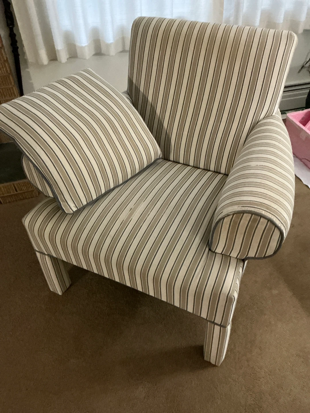 Selling a comfy accent chair featuring a stylish striped pattern! It comes with a matching pillow for extra coziness. Perfect for adding a touch of charm to any room in your home