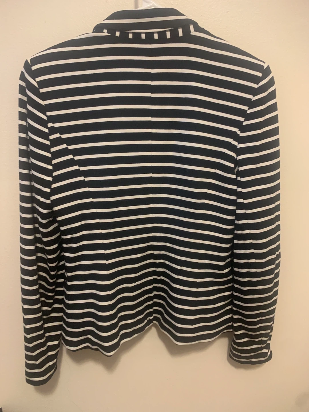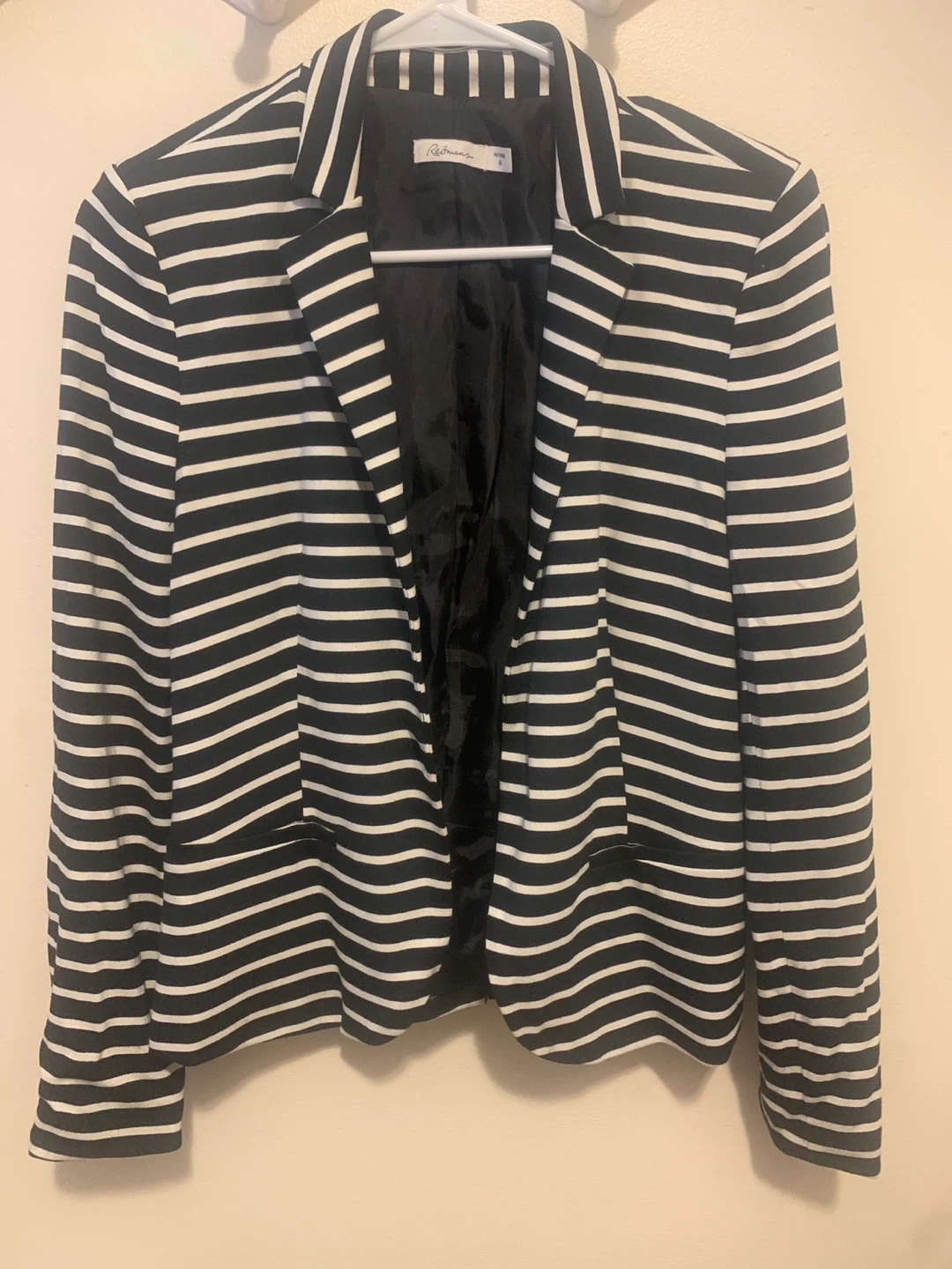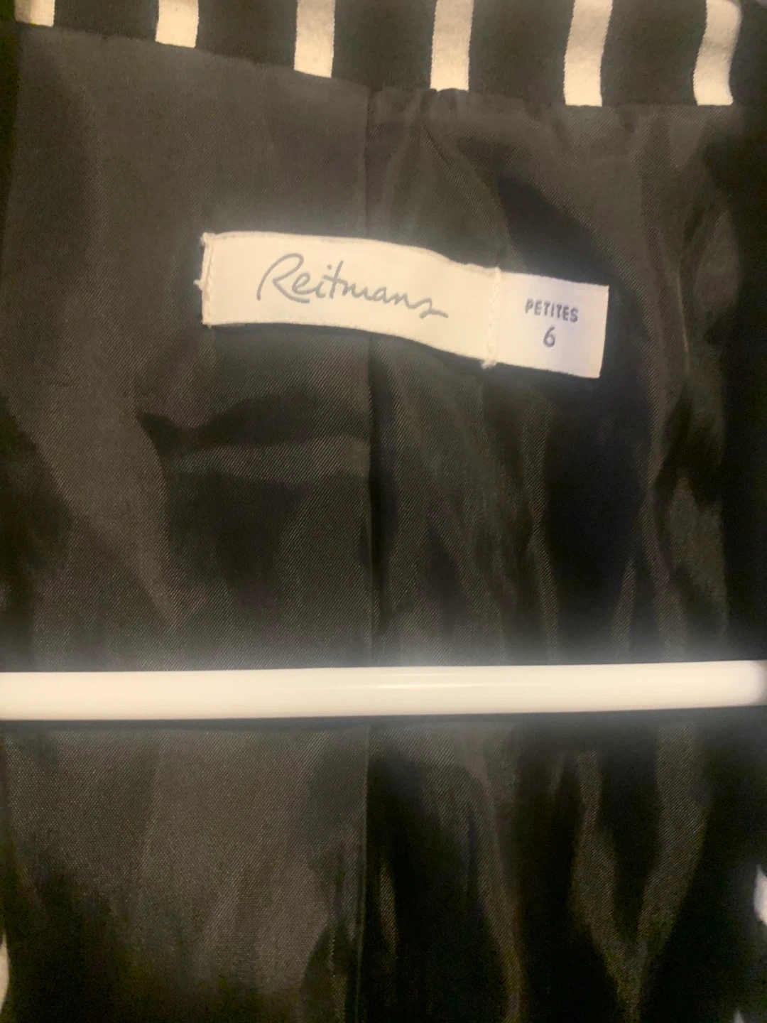 Reitmans blazer in a petite size 6! It features a stylish black and white striped pattern. Perfect for adding a touch of sophistication to any outfit