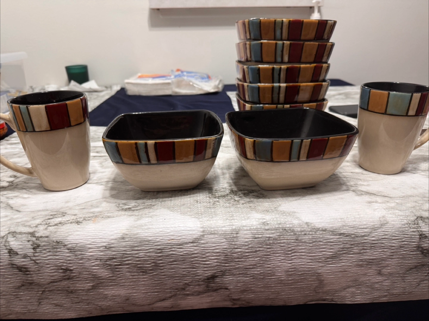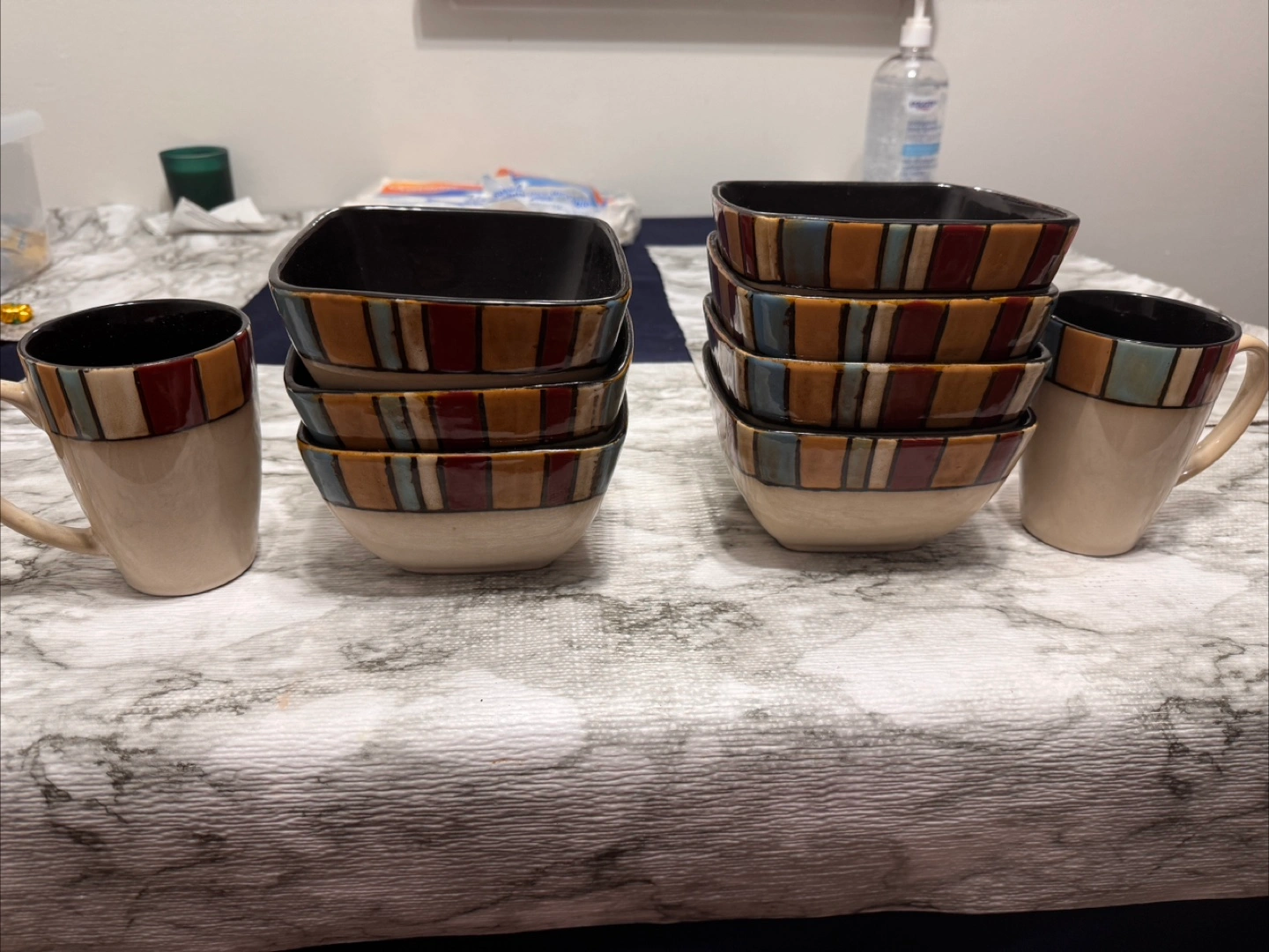 Selling a set of ceramic bowls and mugs. They feature a striped design with earth-tone colours on the top half and a beige colour on the bottom half. Perfect for everyday use!