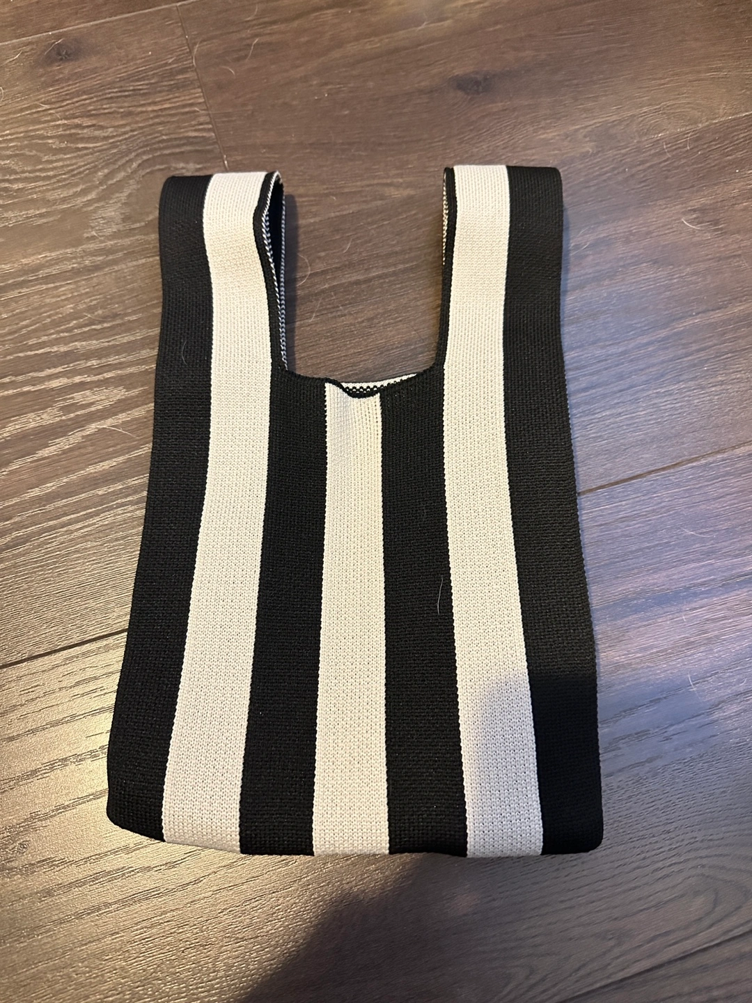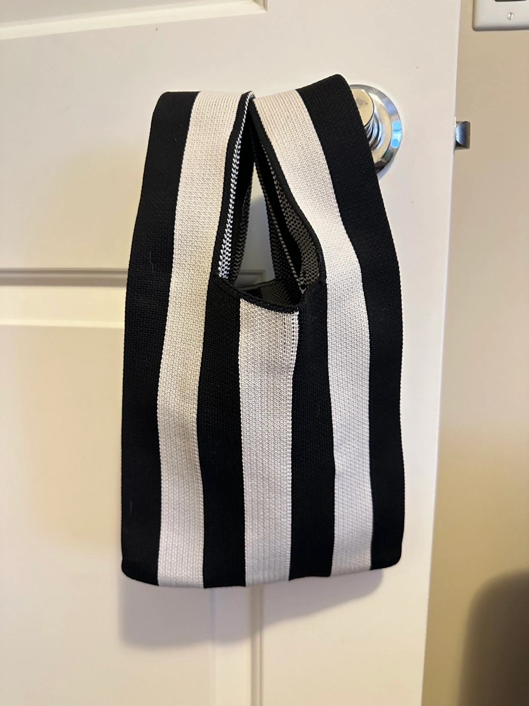 Here's a cute striped knit tote bag! It's perfect for carrying your essentials. The black and white stripes give it a classic look, and the knit material is soft and durable. Pick-up in Richmond.