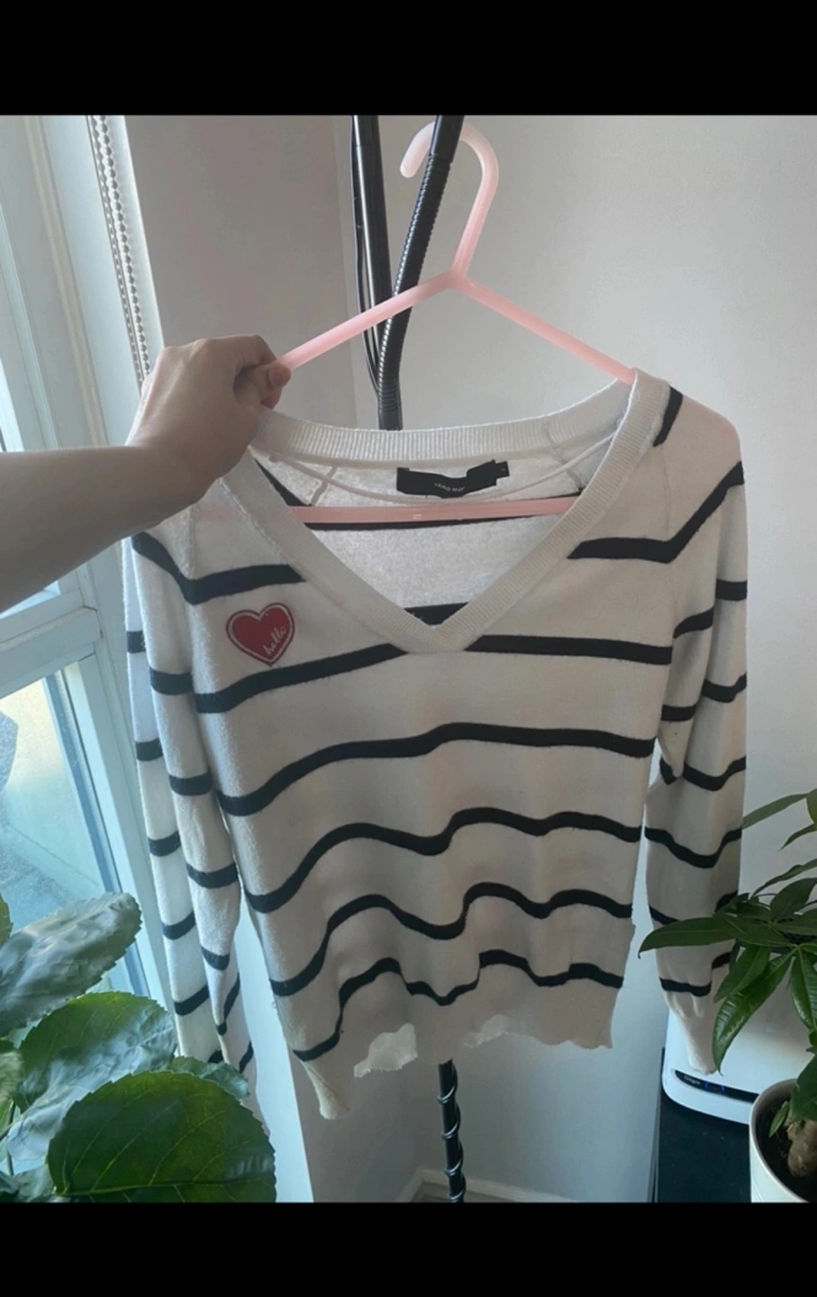White and black striped sweater. V-neck design. Features a small heart patch. Long sleeves.