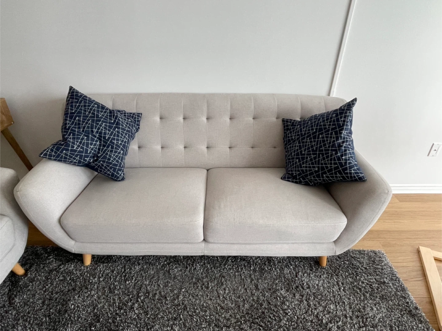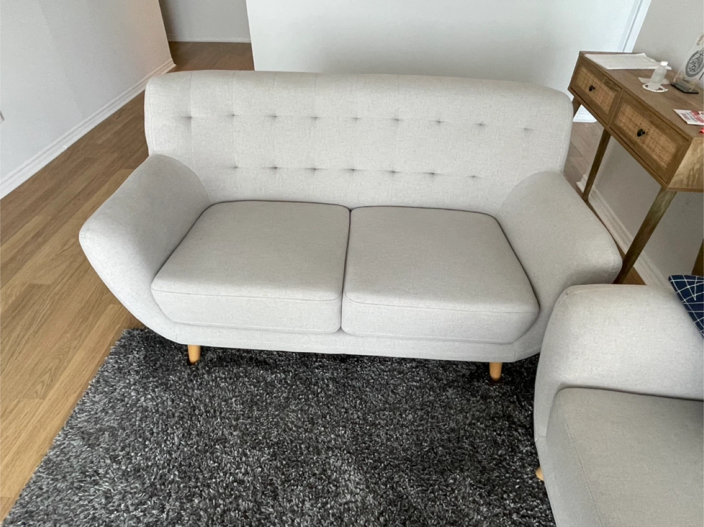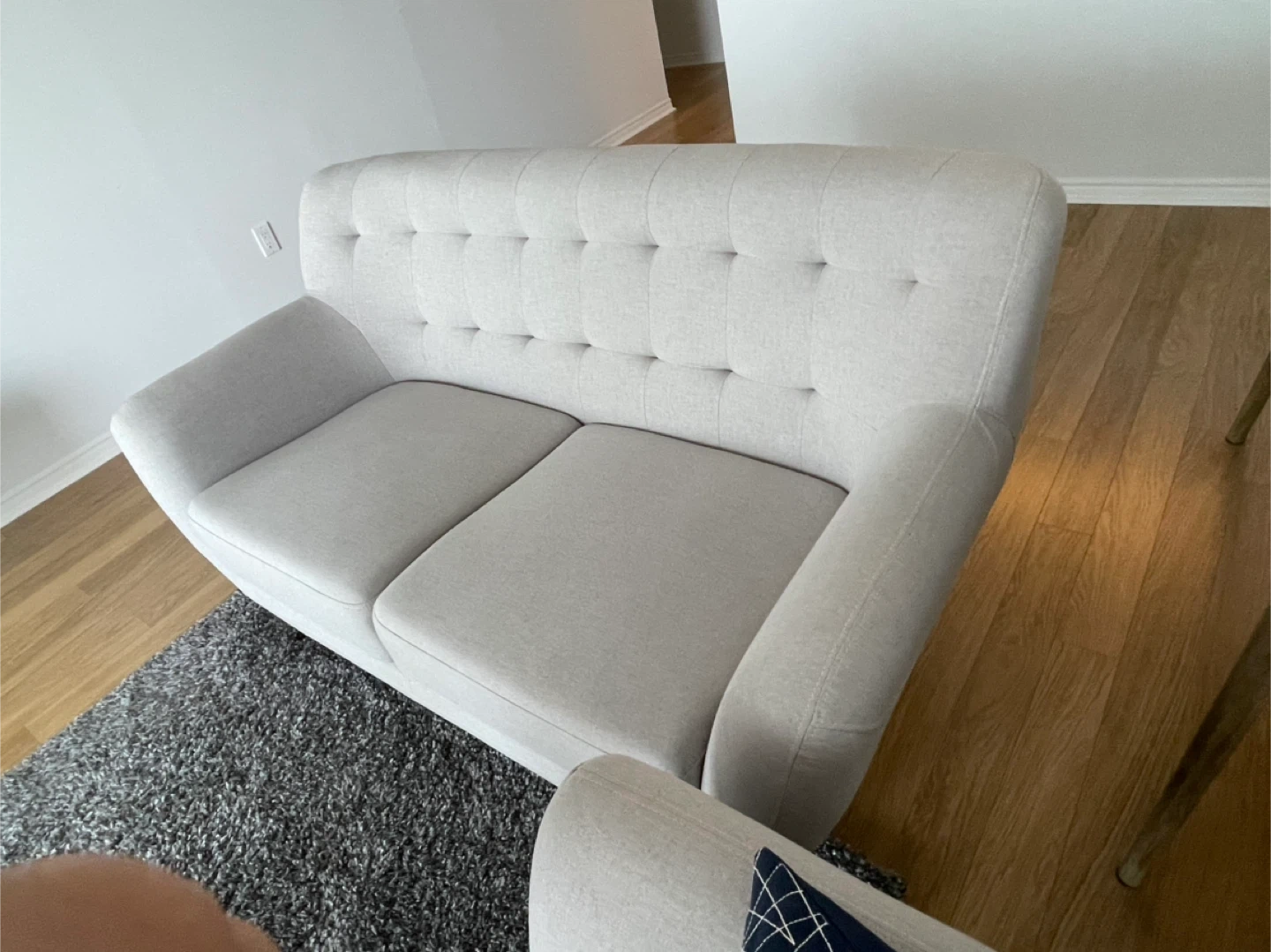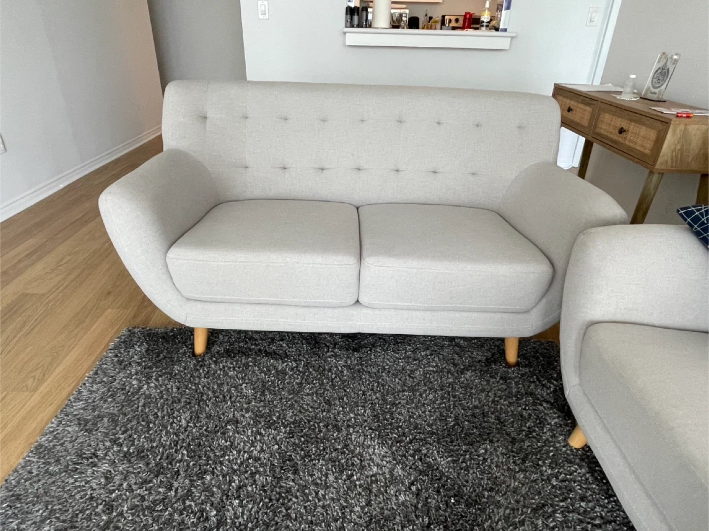 A cozy loveseat sofa in a light grey fabric. It's in great shape and ready for a new home! Perfect for small spaces or as an addition to your living room setup. The fabric is soft and comfortable, making it a great spot to relax.