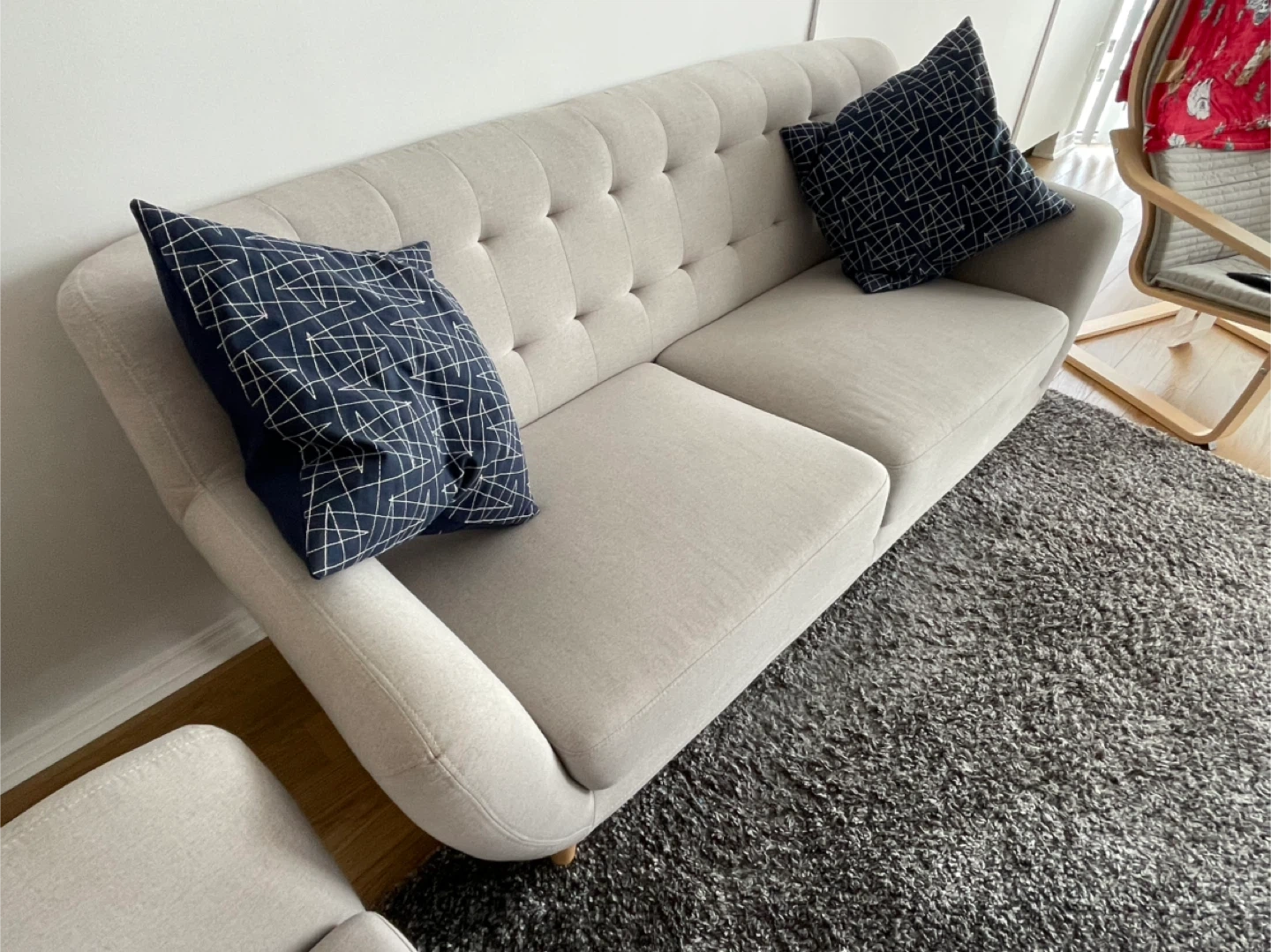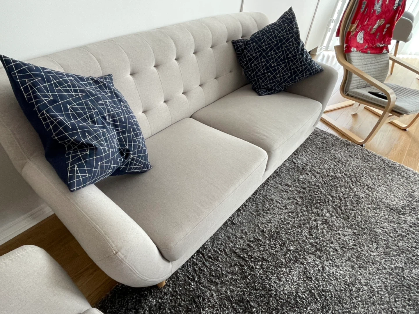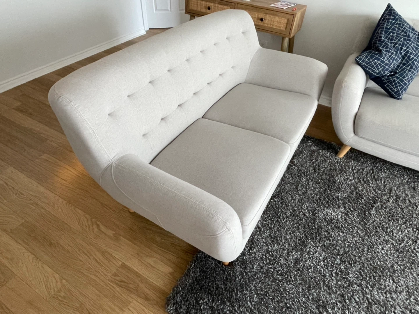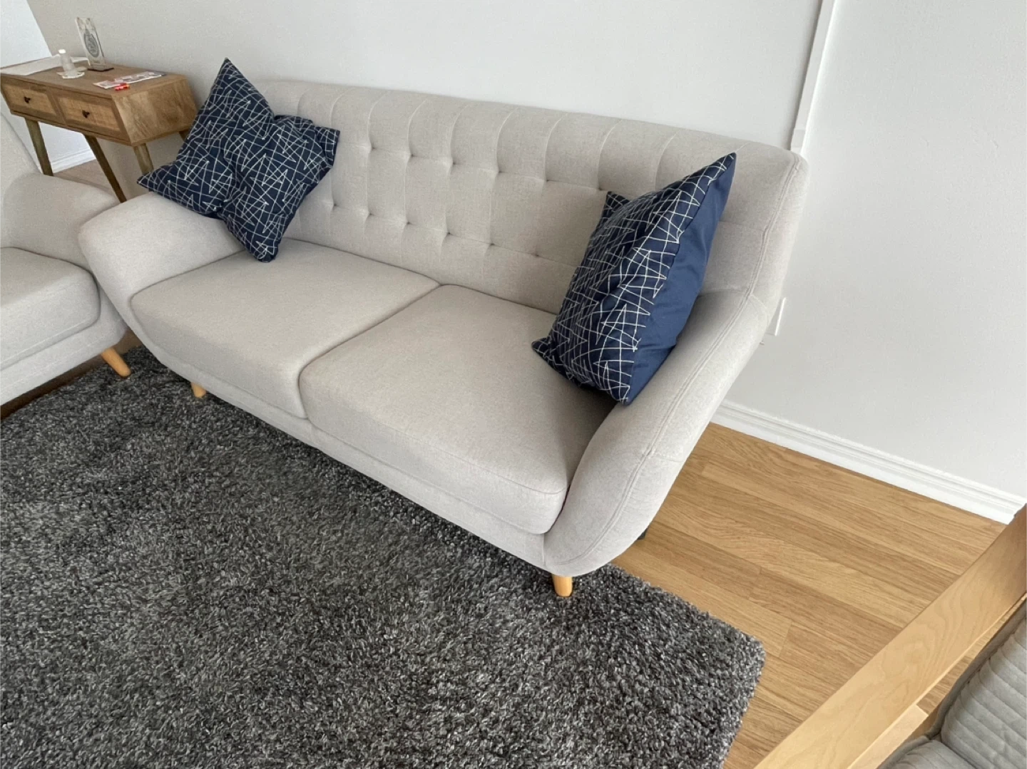 A cozy loveseat sofa in a light grey fabric. It's in great shape and ready for a new home! Perfect for small spaces or as an addition to your living room setup. The fabric is soft and comfortable, making it a great spot to relax.