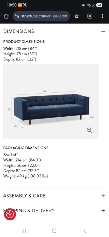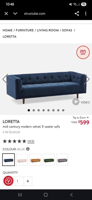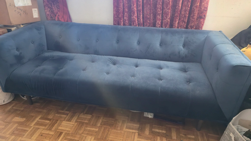 Selling a Structube Loretta mid-century modern velvet 3-seater sofa in blue! It measures 84" wide, 30" high, and 32" deep. This sofa is in great condition and would look lovely in any living space Structube “Loretta” Velvet 3-Seater Sofa — Excellent Condition, $350 Description: Model: Loretta (by Structube) — mid-century modern style with clean lines and plush velvet upholstery. Color / Material: Blue velvet Condition: Gently used; well maintained in a smoke-free home. No stains, rips, or structural damage. Some minor wear (see photos). Size / Dimensions: Width: 214 cm (84.3") Height:56 cm (22.0") Depth: 82 cm (32.3") Original Price: Originally purchased for $749 + tax Asking Price: $300 Pick-up Location: Scarborough / Toronto