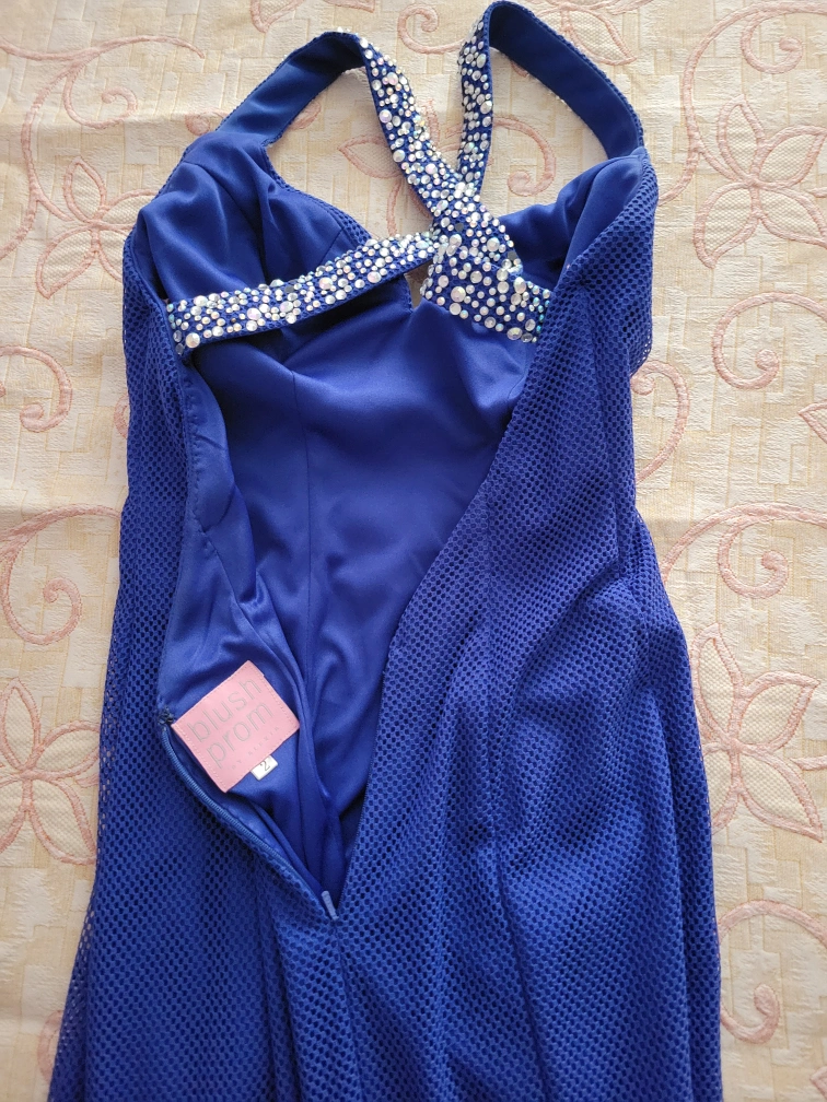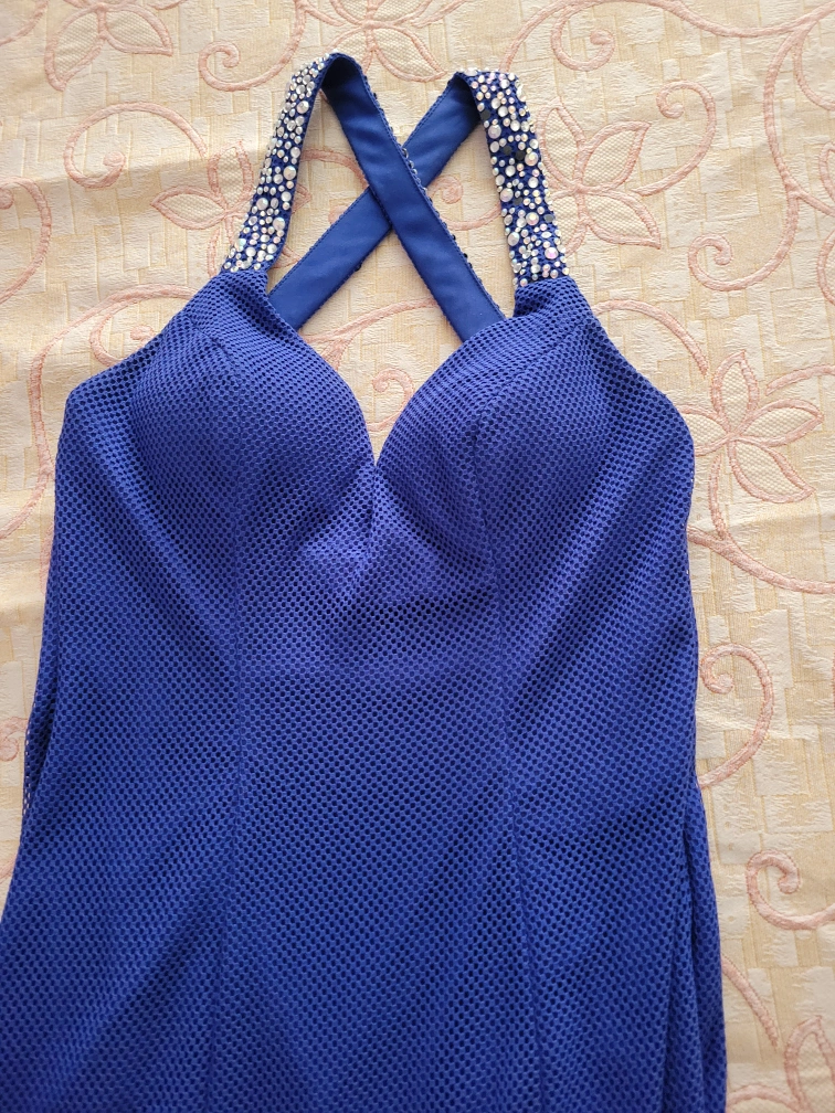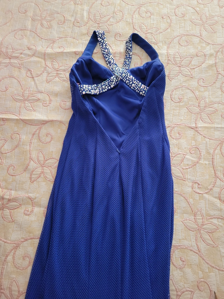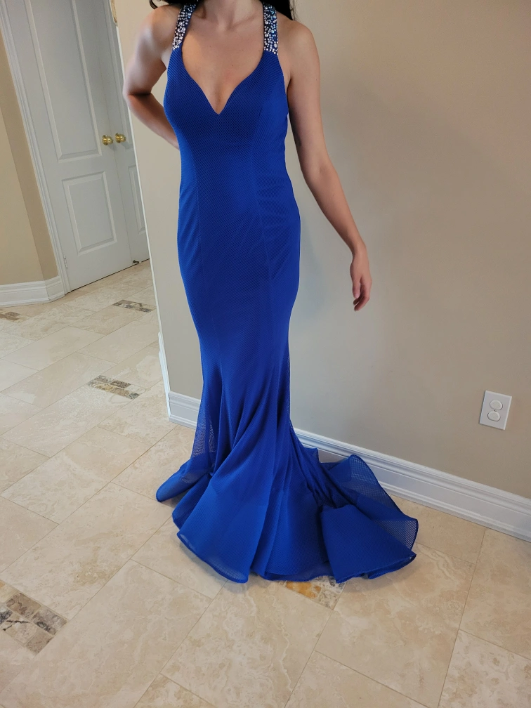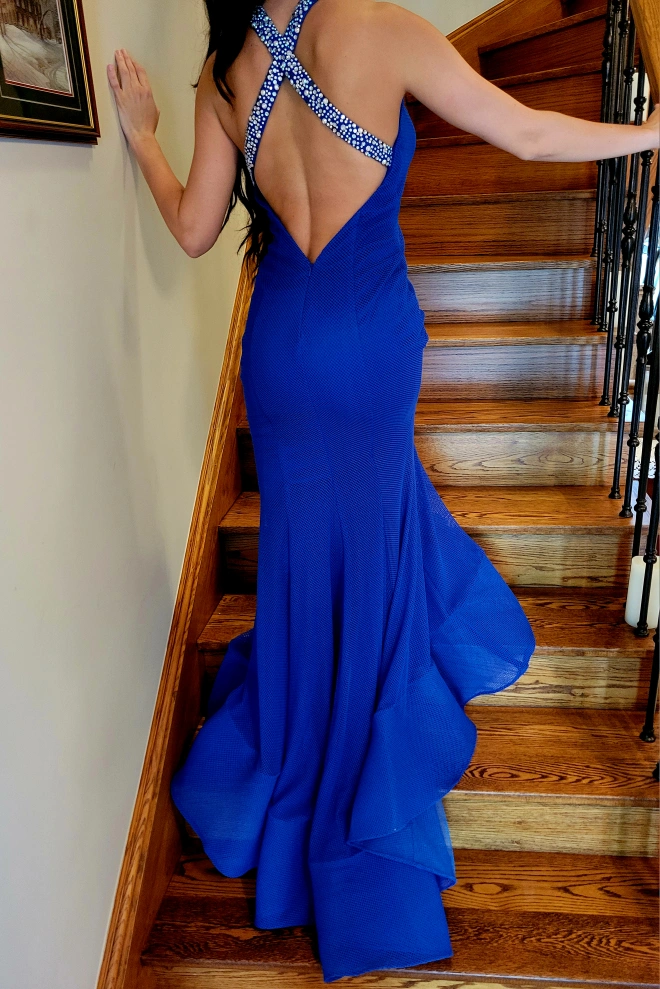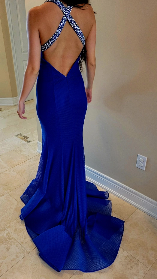 Stunning, Elegant and Unique electric blue long gown with flared bottom and train. Mesh shell and jeweled straps with plunging v-neck and back. You will be the envy of the event.