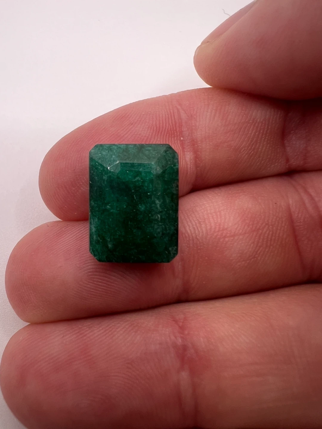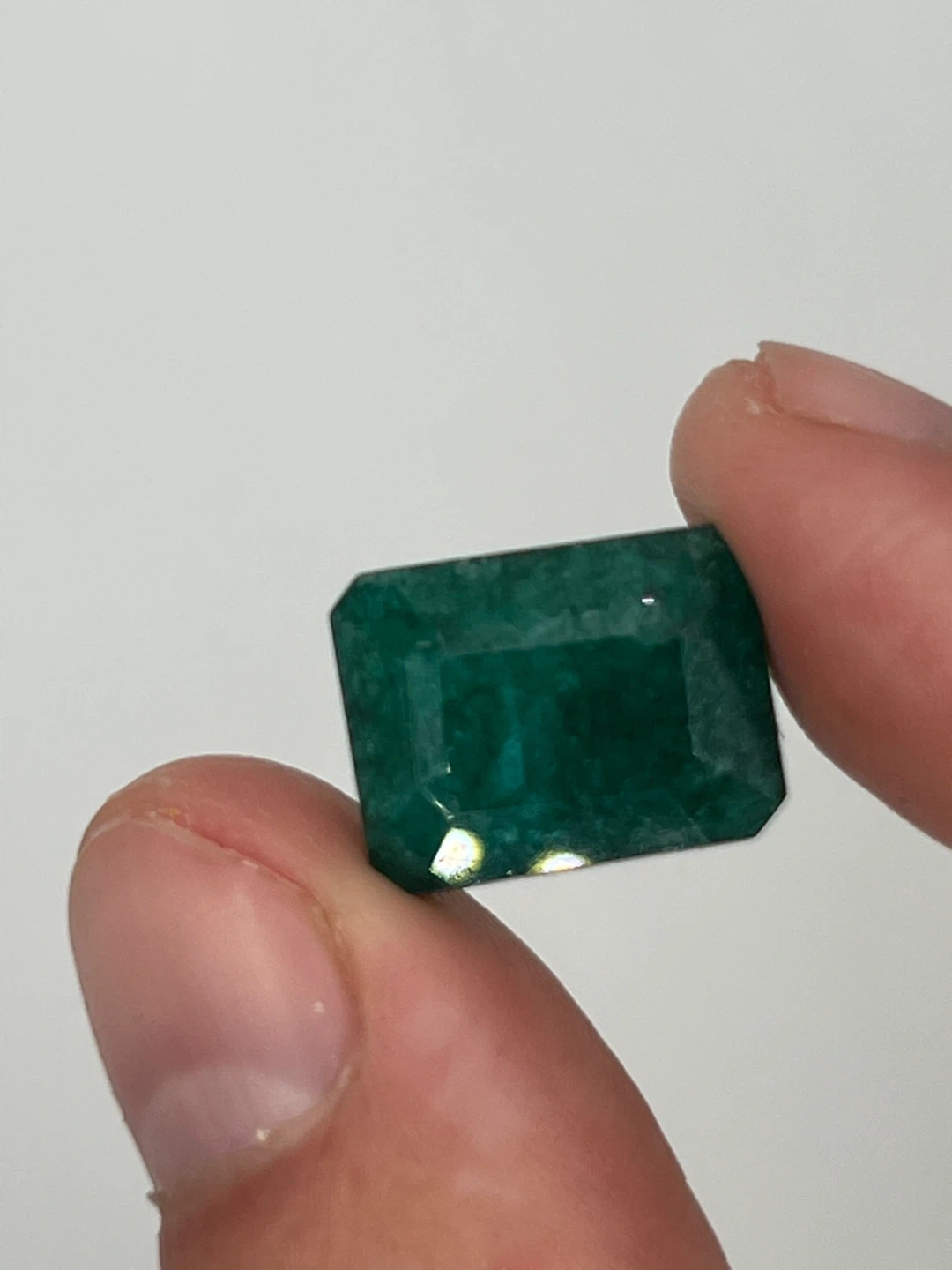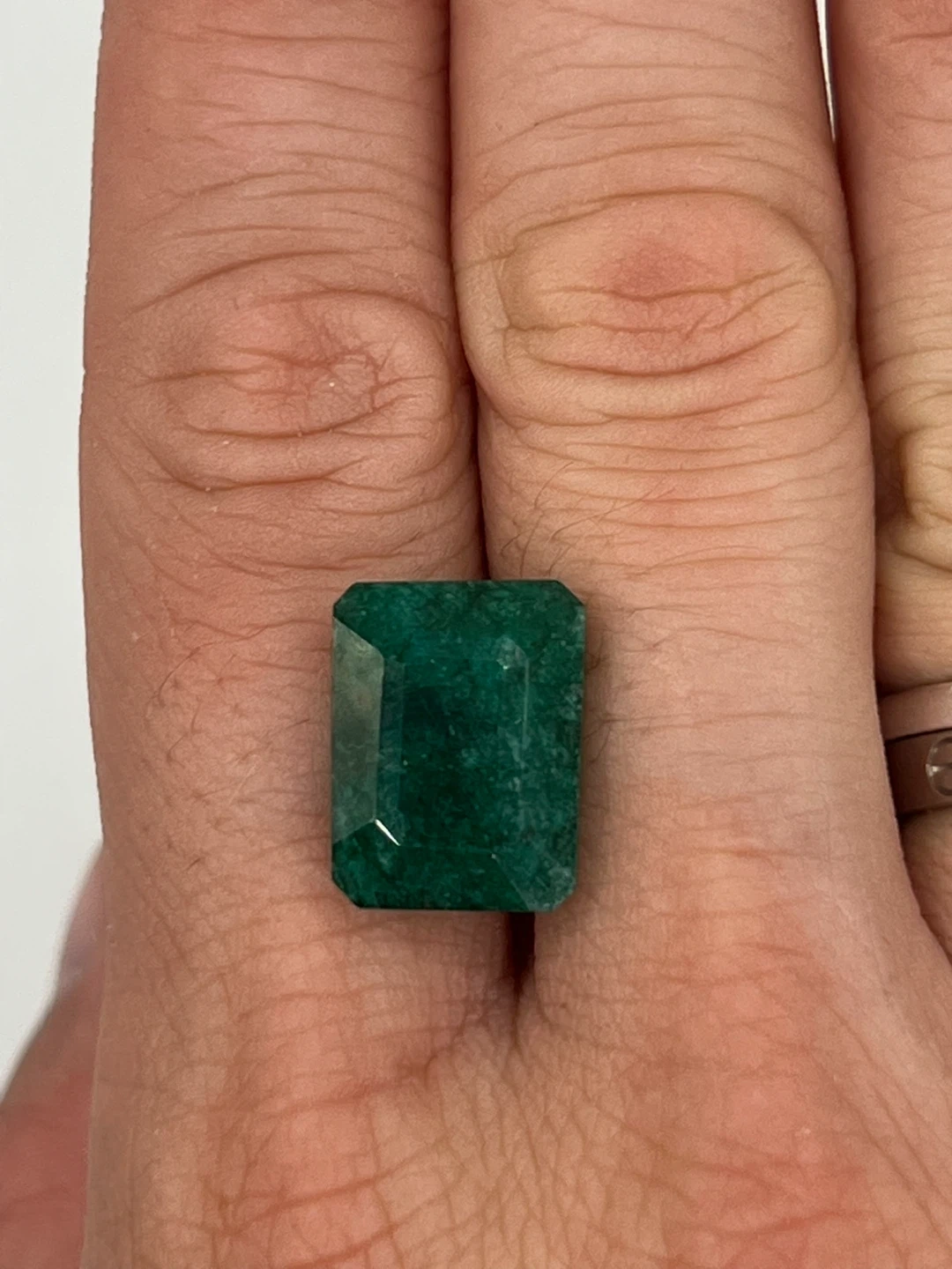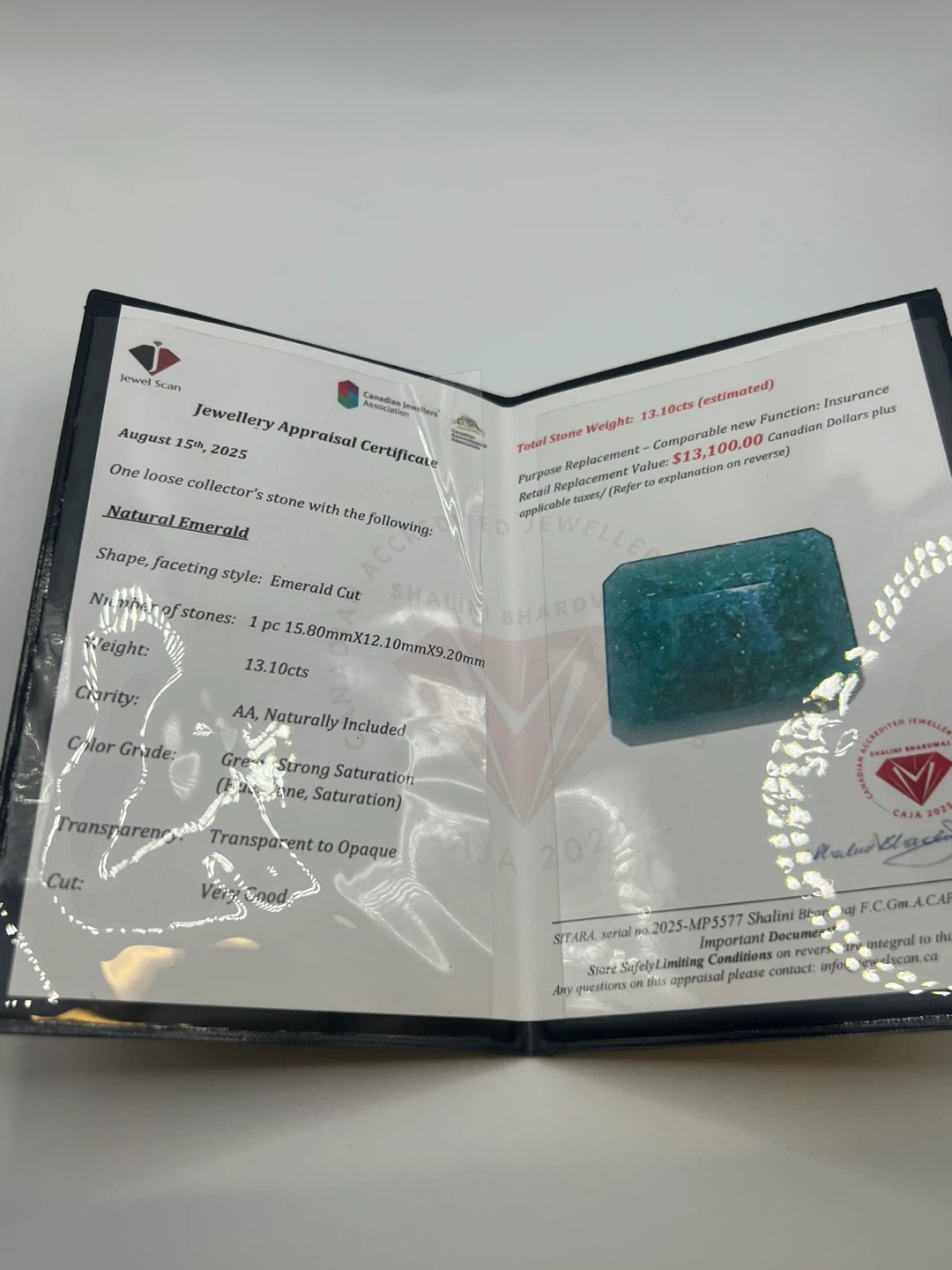 Selling a beautiful natural emerald cut loose stone. It weighs 13.10 carats and has a AA clarity grade, naturally included. The colour grade is green, with strong saturation. Dimensions are 15.80mm x 12.10mm x 9.20mm. Appraised at $13,100.00 Canadian Dollars.