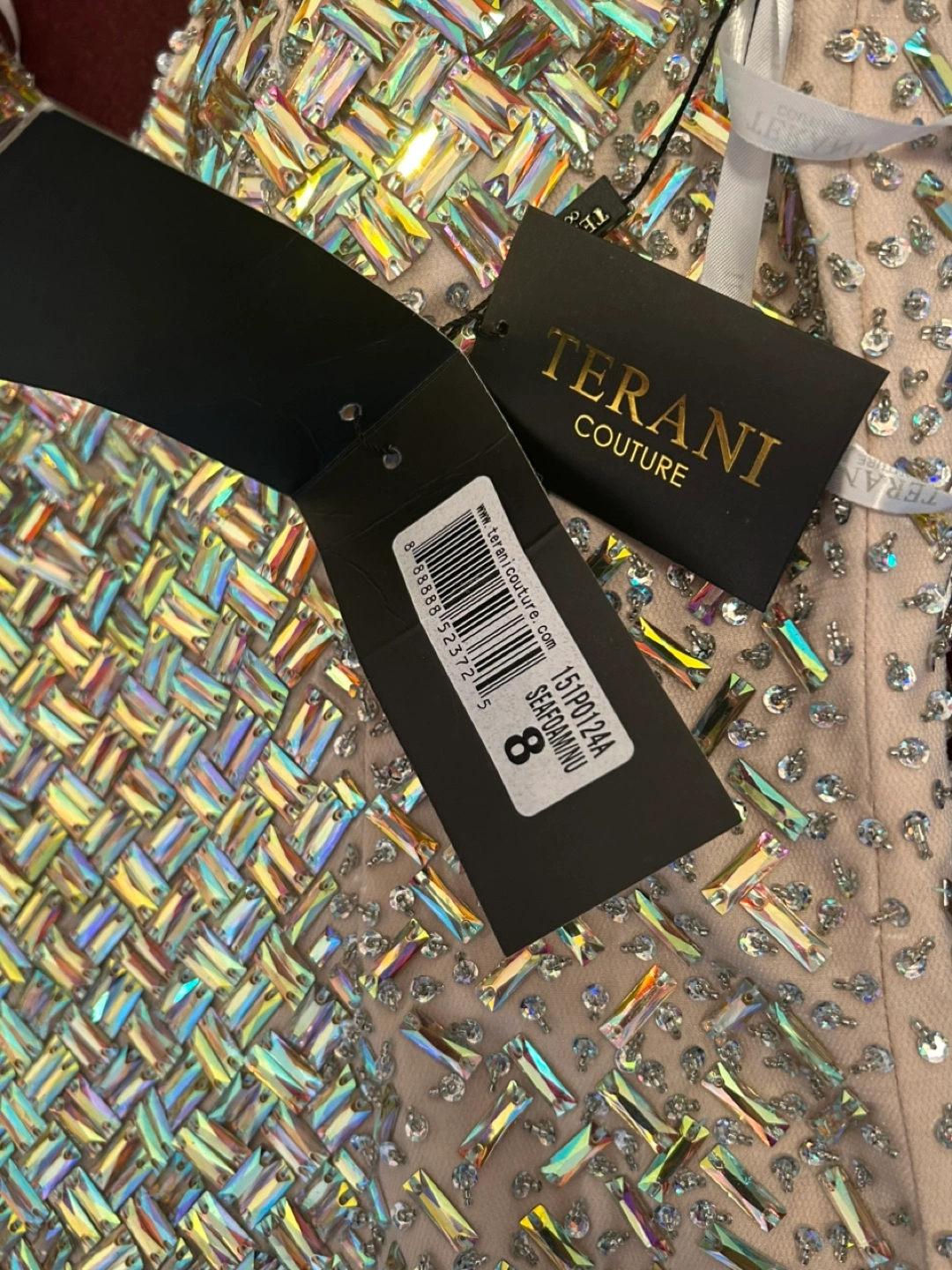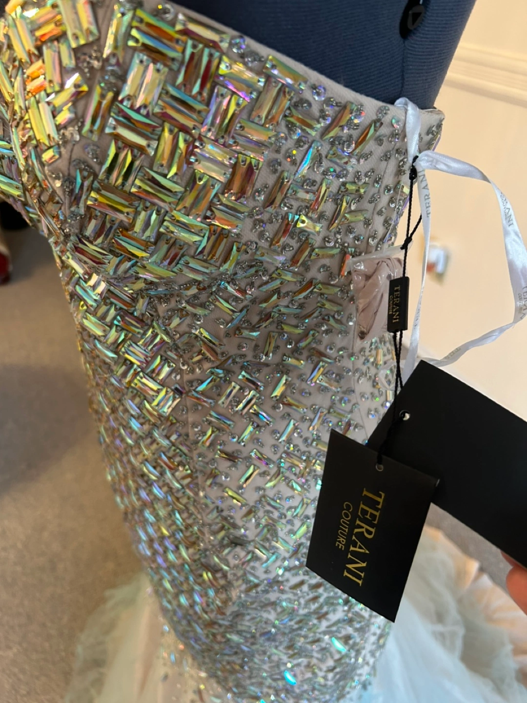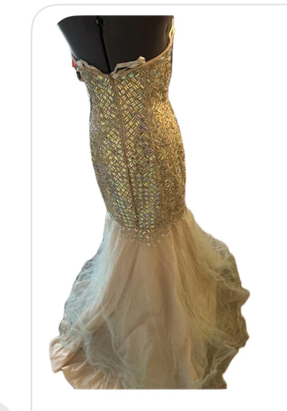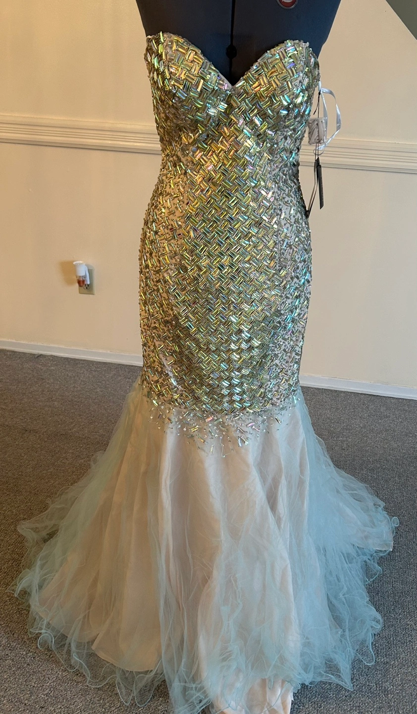 Gorgeous, floor-length mermaid gown. Features a sweetheart neckline and intricate beading. Champagne bodice with a light blue tulle skirt. Perfect for prom or a special occasion. New with tags.