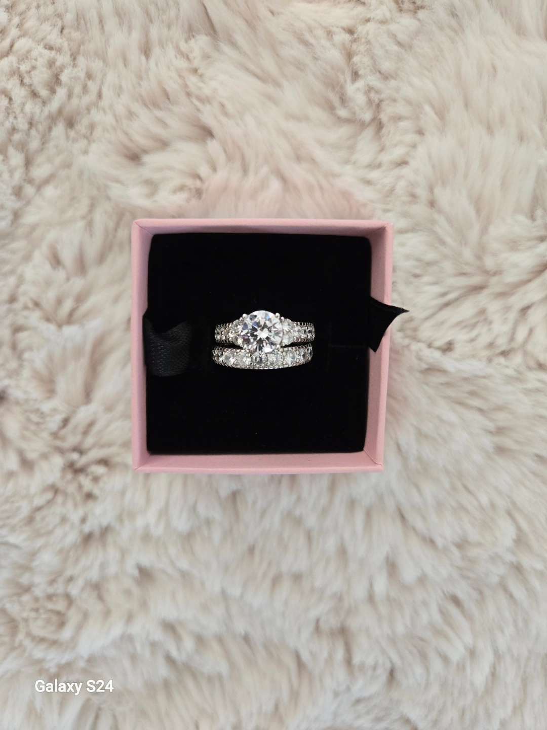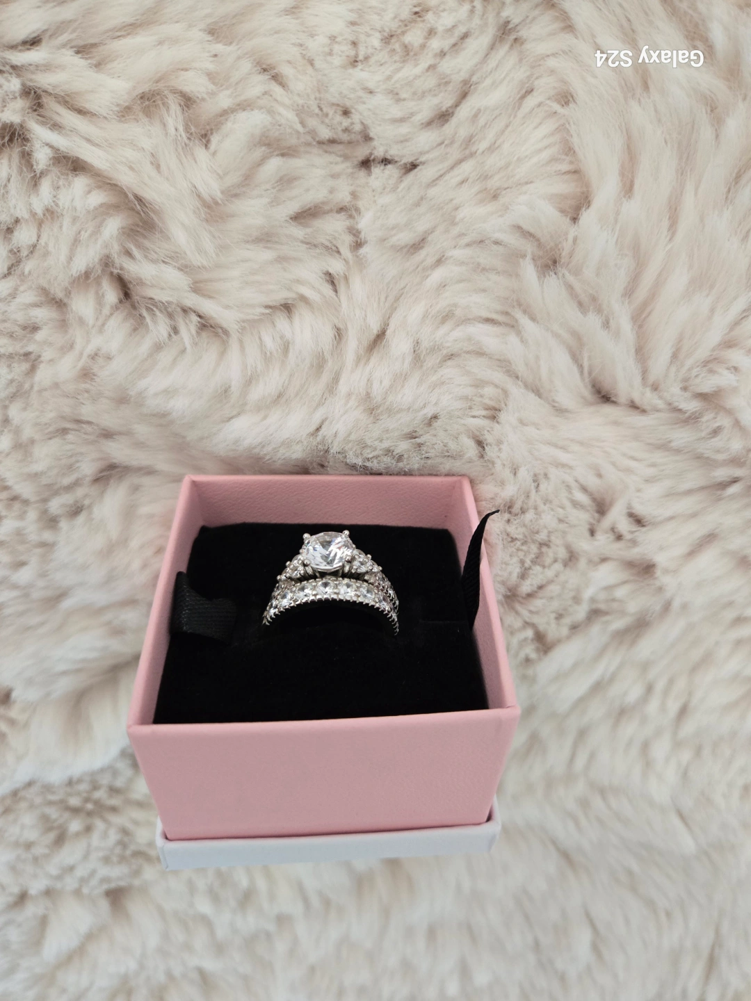 Beautiful ring set. Features a large round-cut centre stone and a smaller pave-set band. Size 7. Comes in a pink box. Elegant and sparkly. Sterling silver.