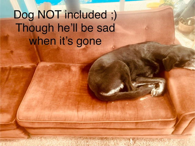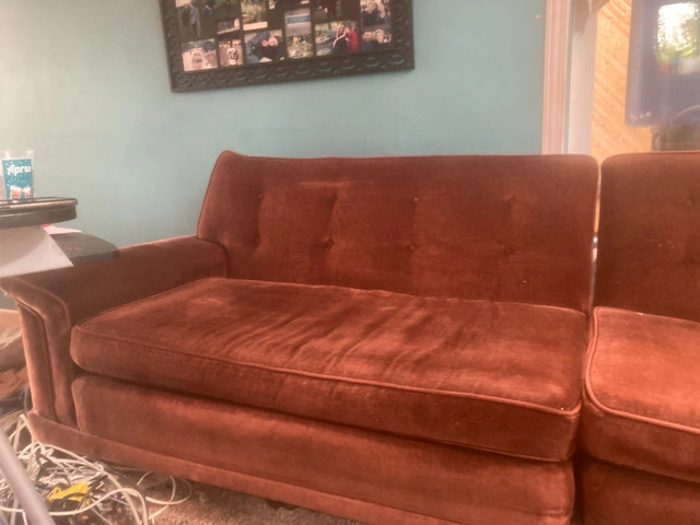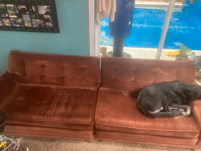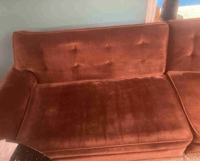 Beautiful vintage like new sofa. Chocolate brown velour without any fading, scratches or stains; Prime condition! Love this very Retro & comfy sofa; doing renovations & unfortunately I don’t have anywhere to put that it won’t get ruined, so looking for a new Loving home. Approximately 96inches total (2pieces) Only serious inquiries please