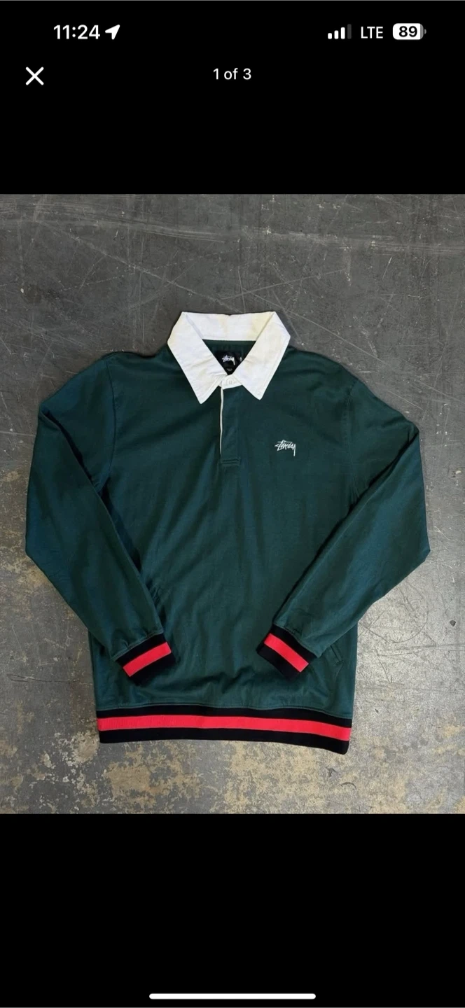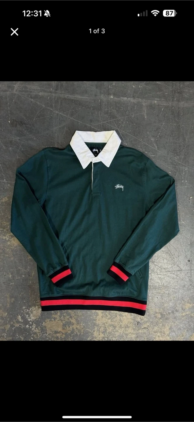 Selling a Stussy rugby shirt in a nice green colour. It features a white collar and red accents on the cuffs and hem. Great for a casual, sporty look!