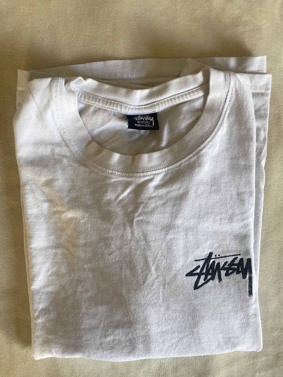 Selling a Stussy white t-shirt with a graphic on the back. It's in great condition and has the classic Stussy logo on the front. The back features a colourful peace sign design with text around it. A cool addition to any wardrobe!