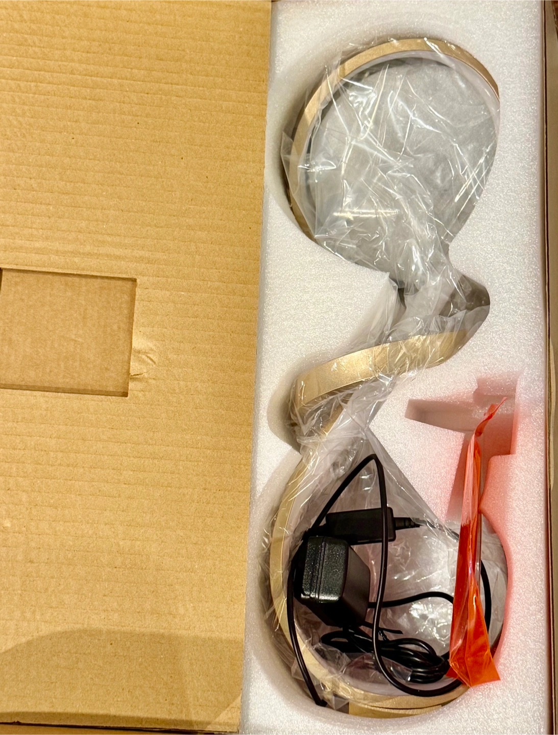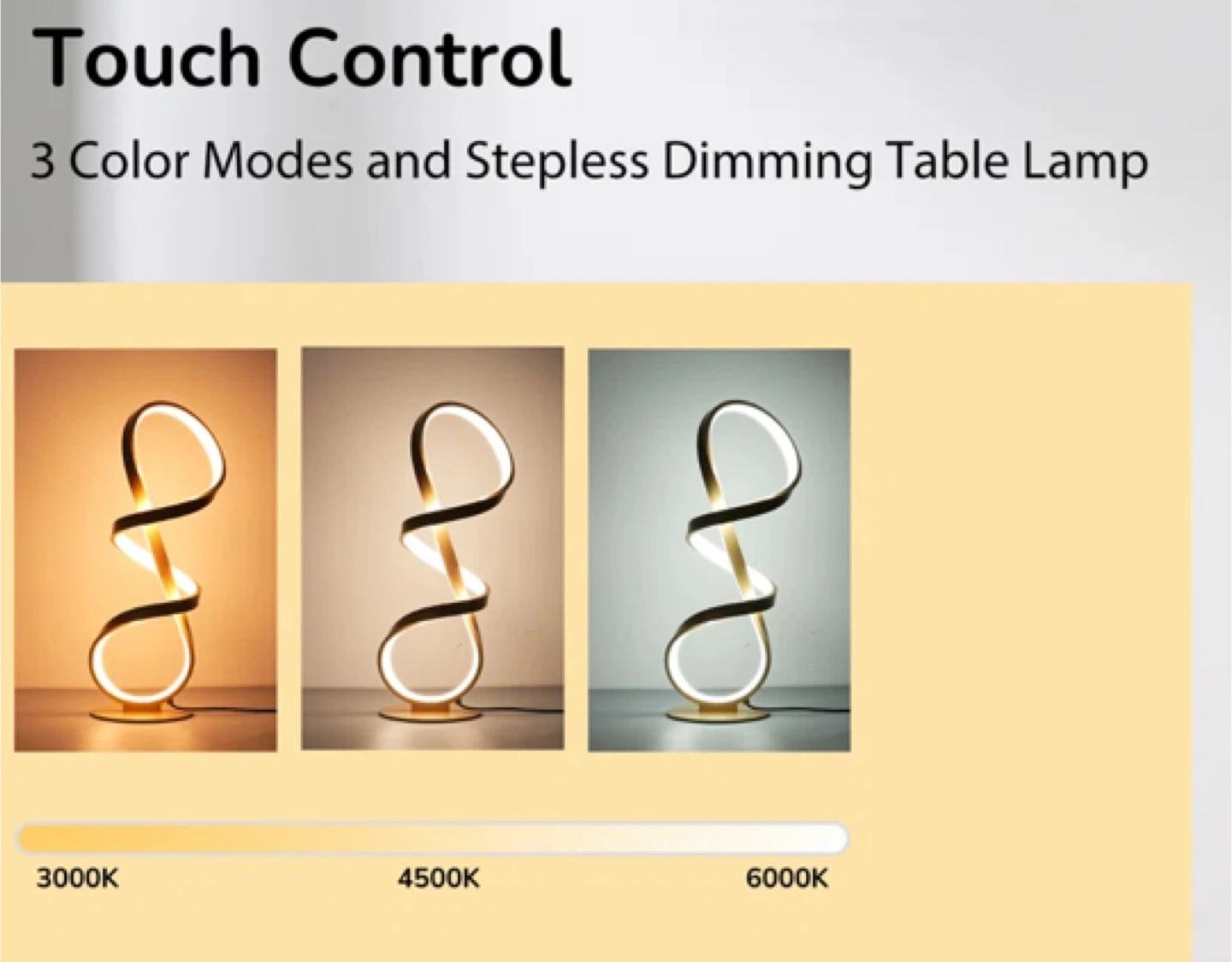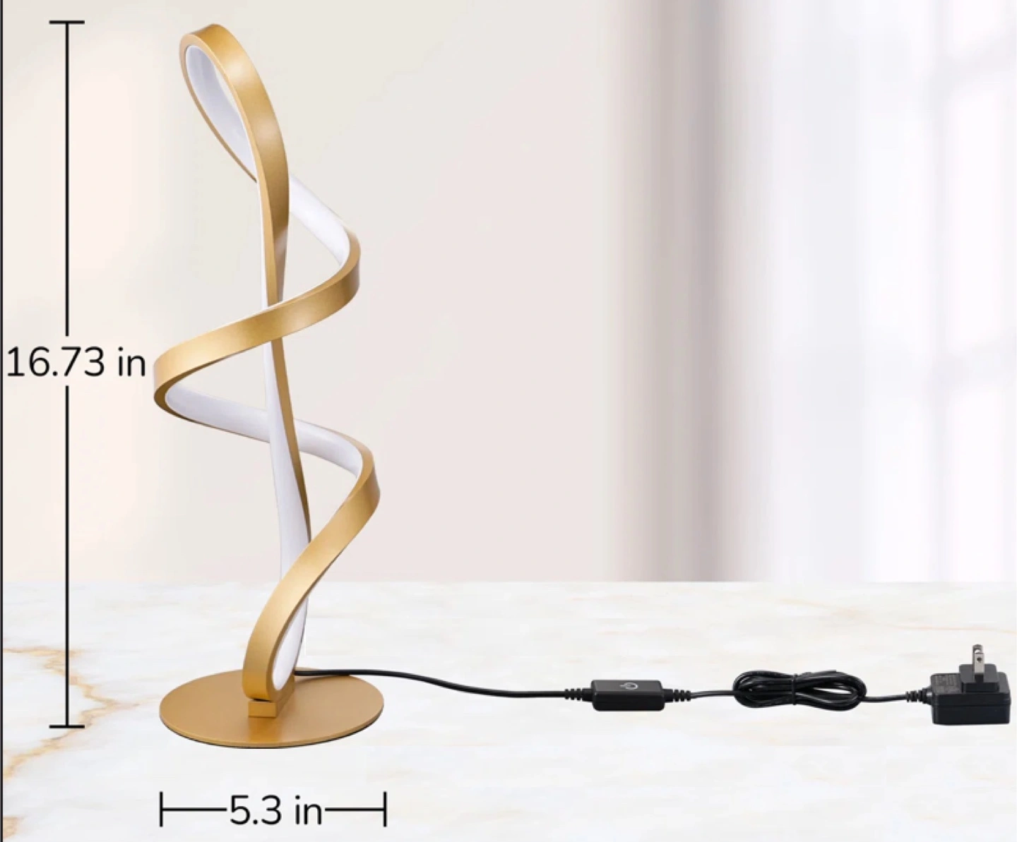 - Brand new, modern spiral loop table lamp in gold - Bright 500-lumen LED with 3 color modes: 3000K / 4500K / 6000K - Dimmable 10%–100% with touch control - Sleek aluminum design, perfect for a desk or bedside - Compact size: 16.73" H x 5.3" W x 5.3" D - Retail: $100