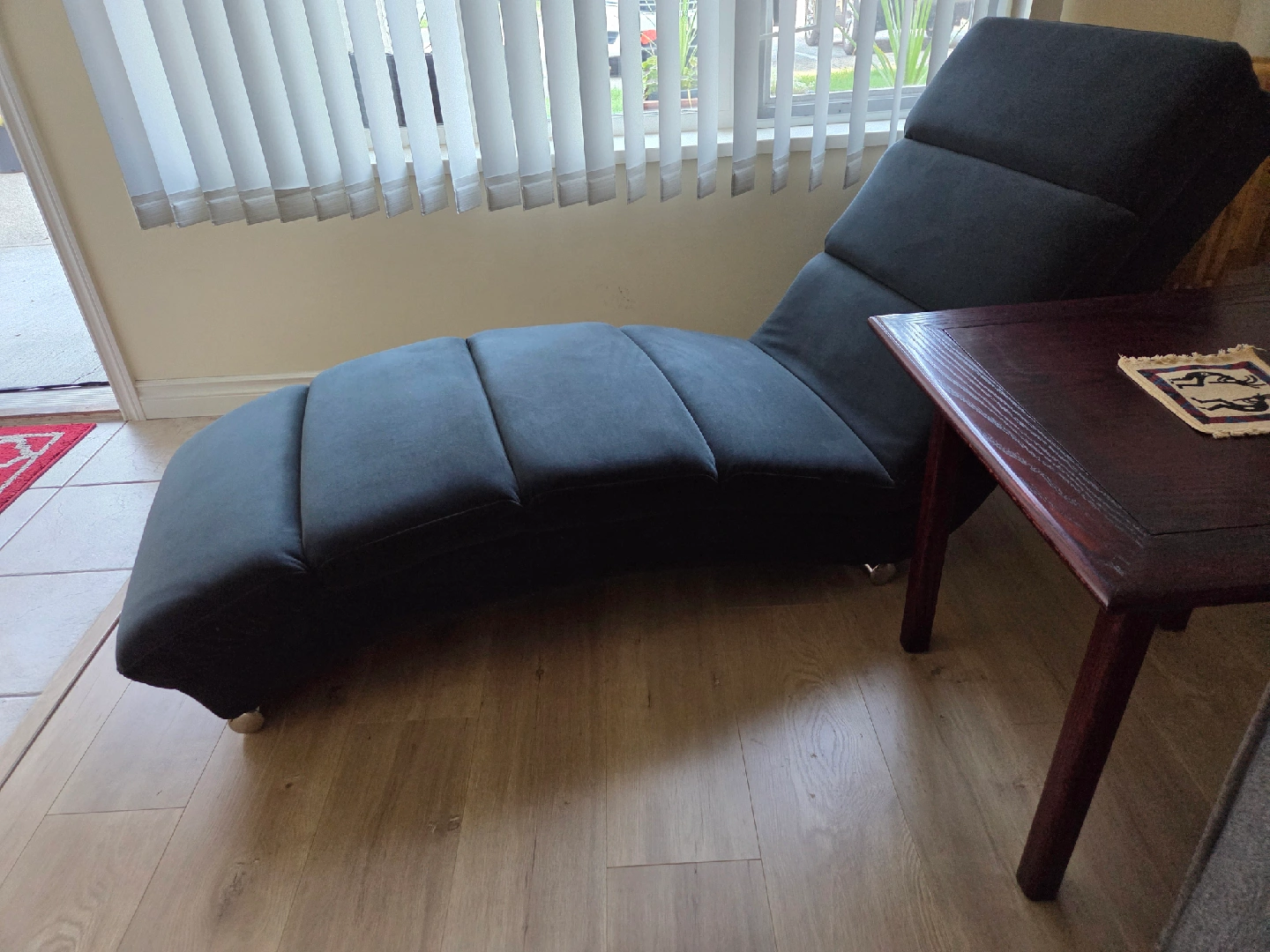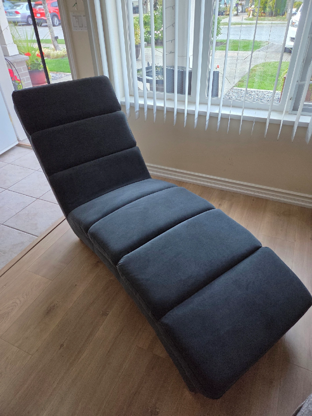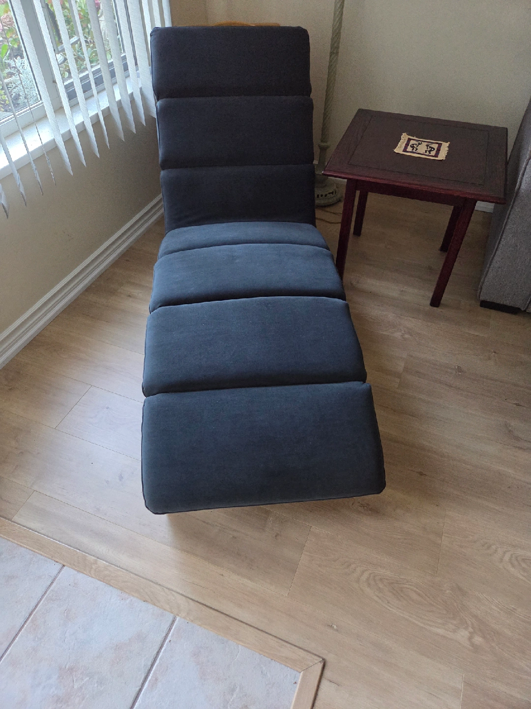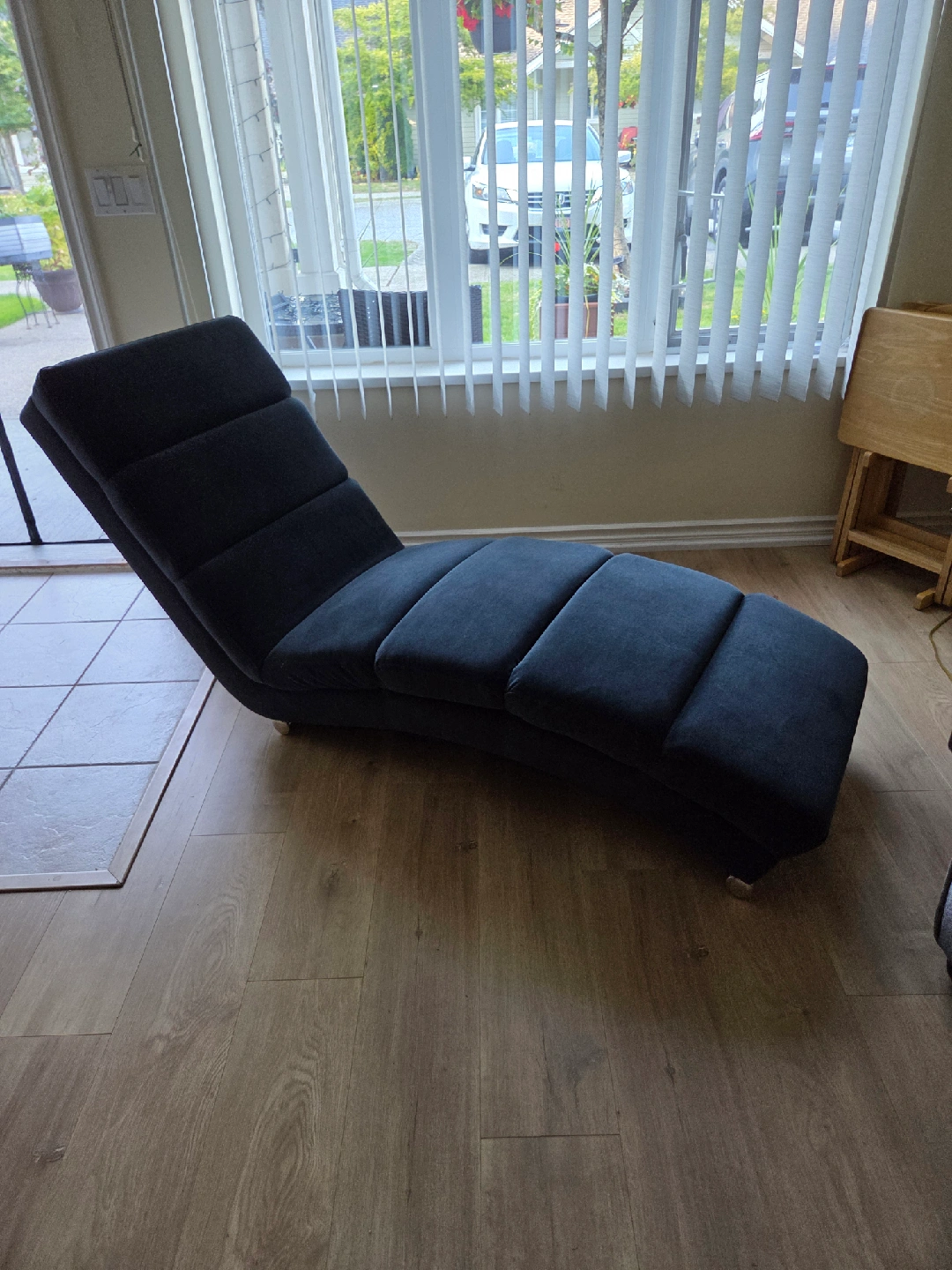 Selling a comfy chaise lounge chair! It's in great shape and would be perfect for relaxing in your living room or bedroom. The blue/grey colour is neutral and will fit in with any decor. It's a great addition to any home!