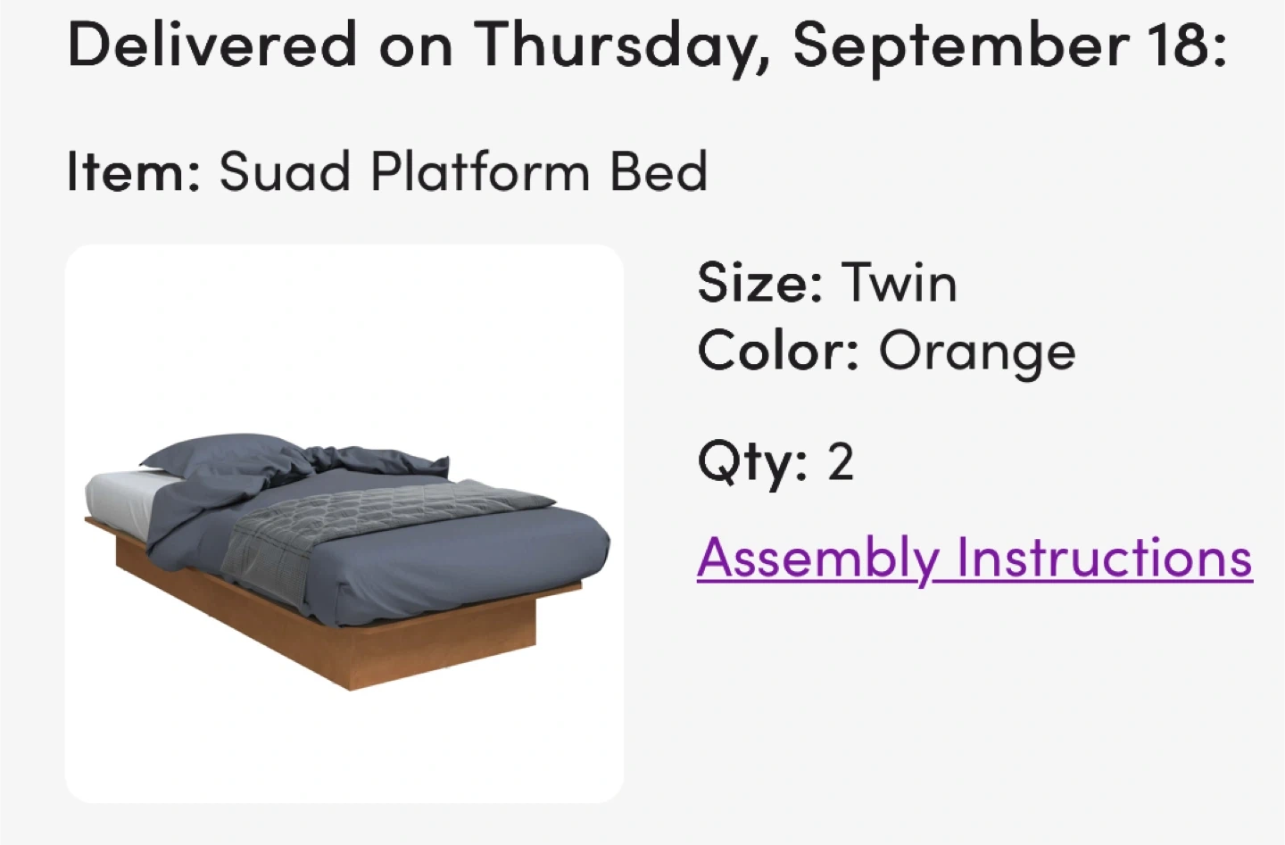 Selling a brand new SUA-V Suad platform bed in twin size. The bed is orange. The dimensions are 38 3/4" x 74 3/4" x 8 5/8". Comes in the original packaging! Price is per bedframe. I have two. Let me know if you want one or both. It arrived late and no longer useful to me