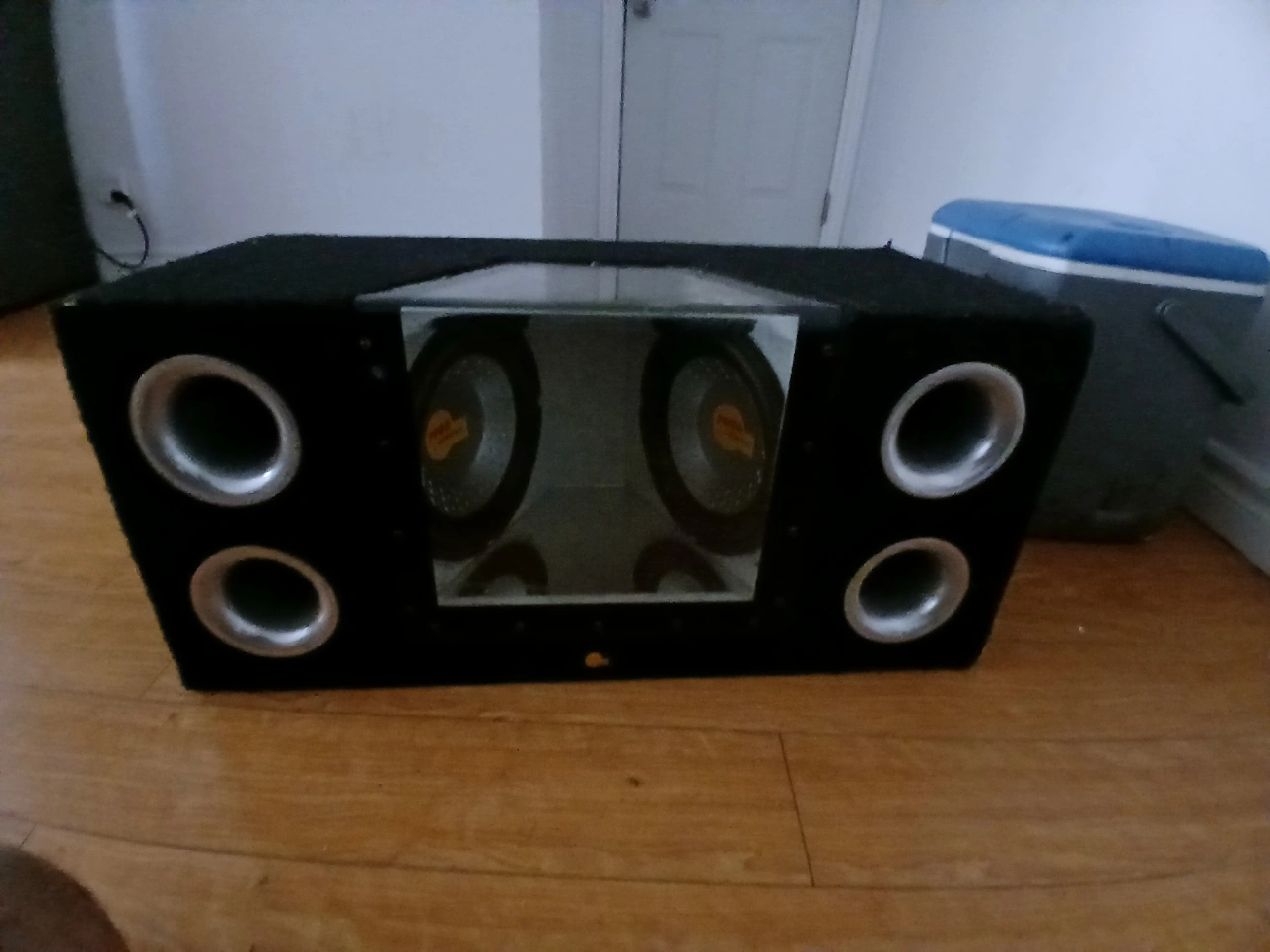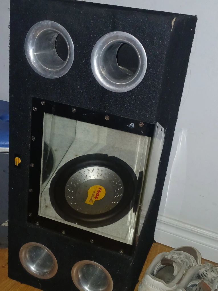 Selling a custom subwoofer box! It's in good condition and ready to boost your car audio. It has a unique design with multiple ports for enhanced bass response. Perfect for any car audio enthusiast looking for a powerful sound upgrade open to offer or trades need gane asap