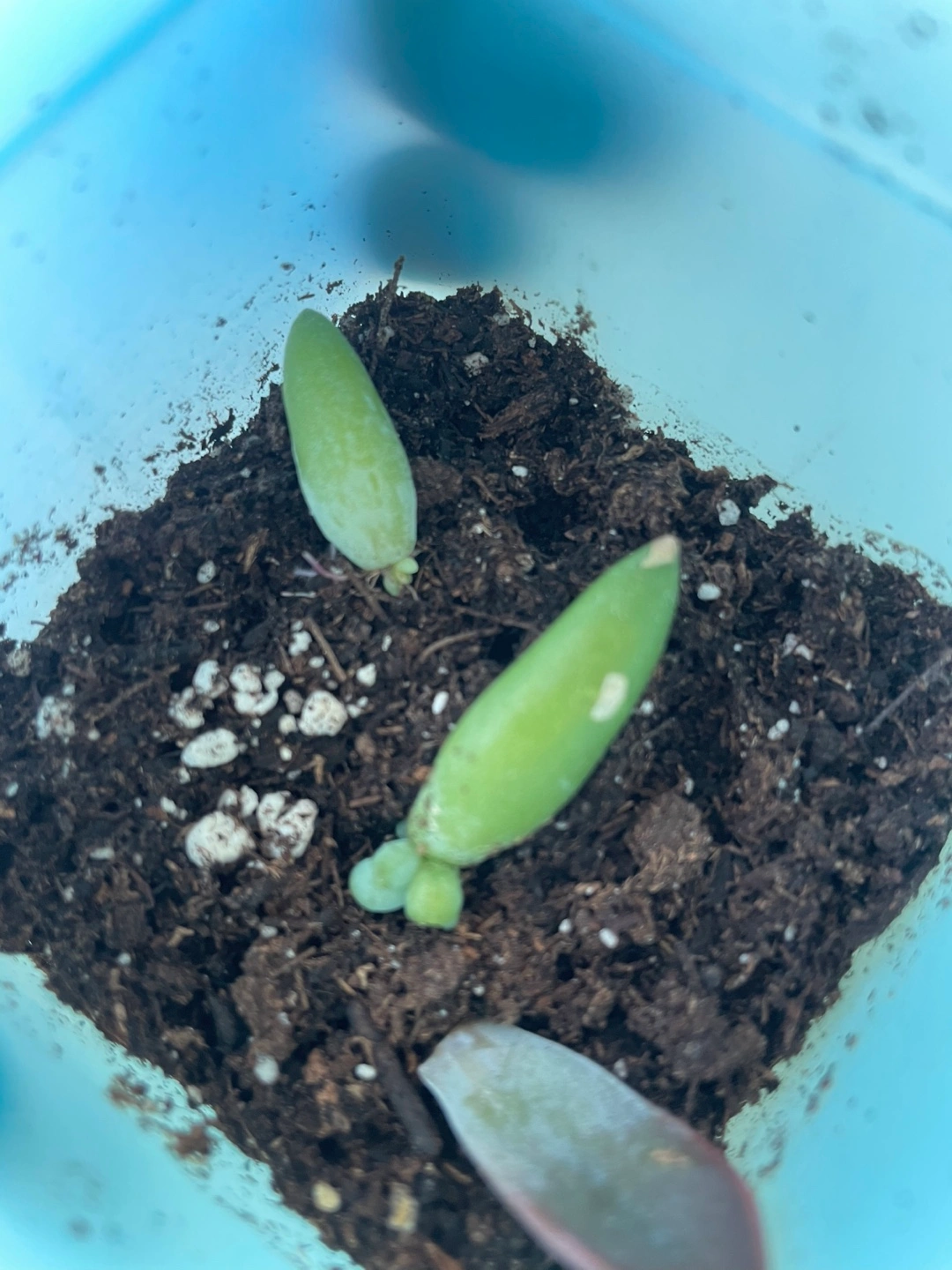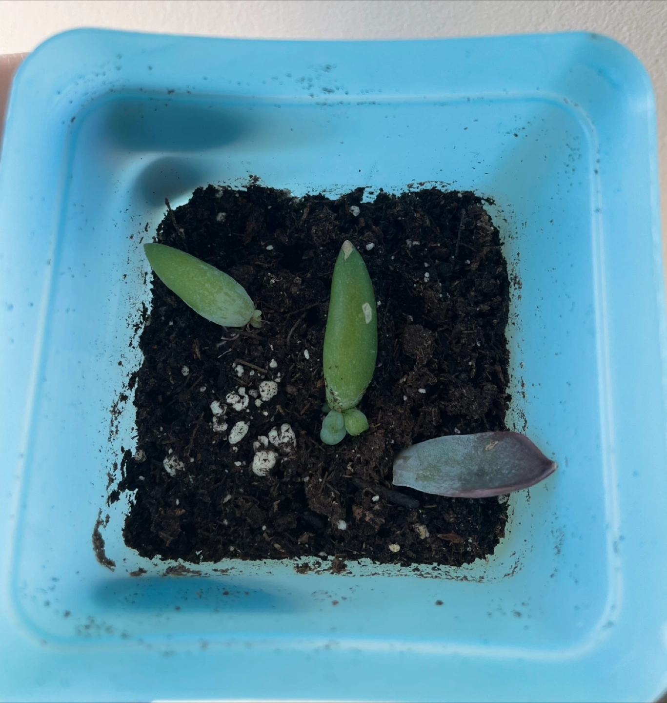 The pot contains 2 burro’s tails and 1 echeveria. Burro’s tail #1 is rooted and pushing out new leaves. Burro’s tail #2 is rooting and has the tiniest new leaves. You can see tiny roots and a bit of green in picture. Echeveria leaf is more fresh and not rooted yet. Comes with the pot and all succulents