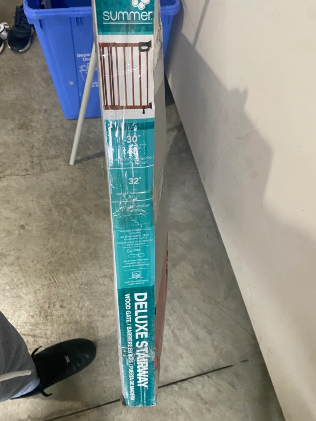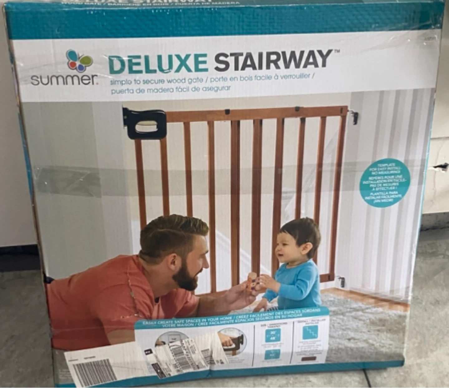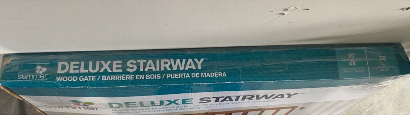 Selling a Summer Deluxe Stairway Wood Gate! It's simple to secure and creates safe spaces in your home. The gate fits openings between 30" and 48" wide and is 32" tall. It's still in its original packaging but the package is ruined but never opened brand new.
