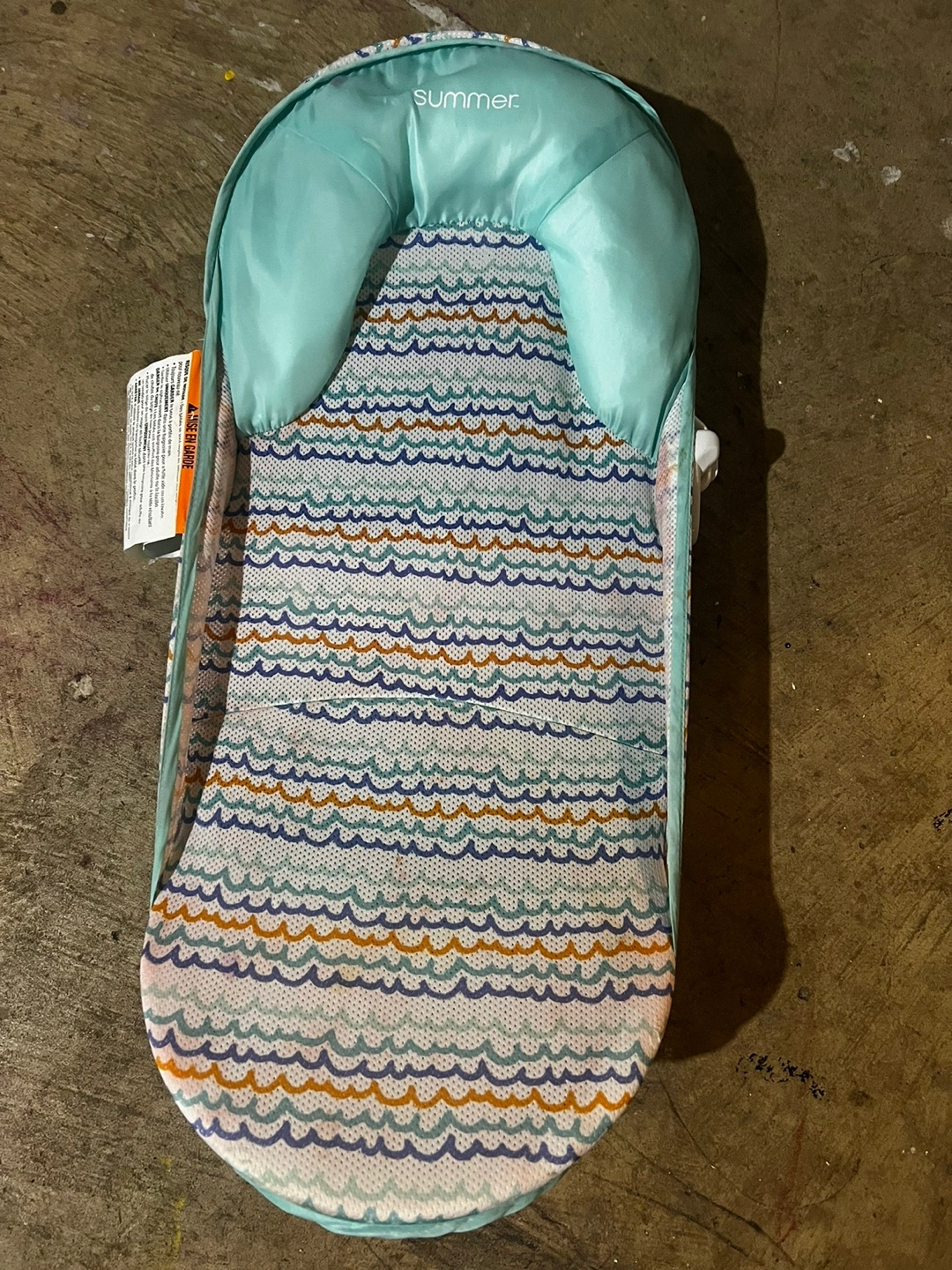 Infant bathtub. Features a mesh design and headrest. Lightweight and portable. Teal and white colour scheme.