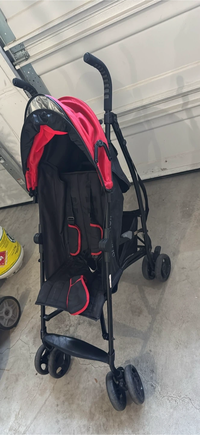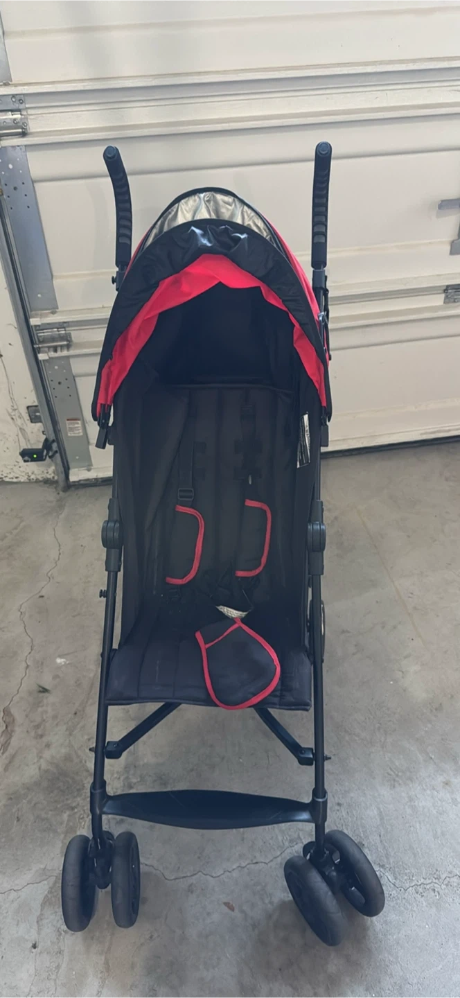 Selling a stroller in good condition! It's black with red accents. Perfect for taking your little one on walks around the neighbourhood or trips to the park. Great for travelling etc.