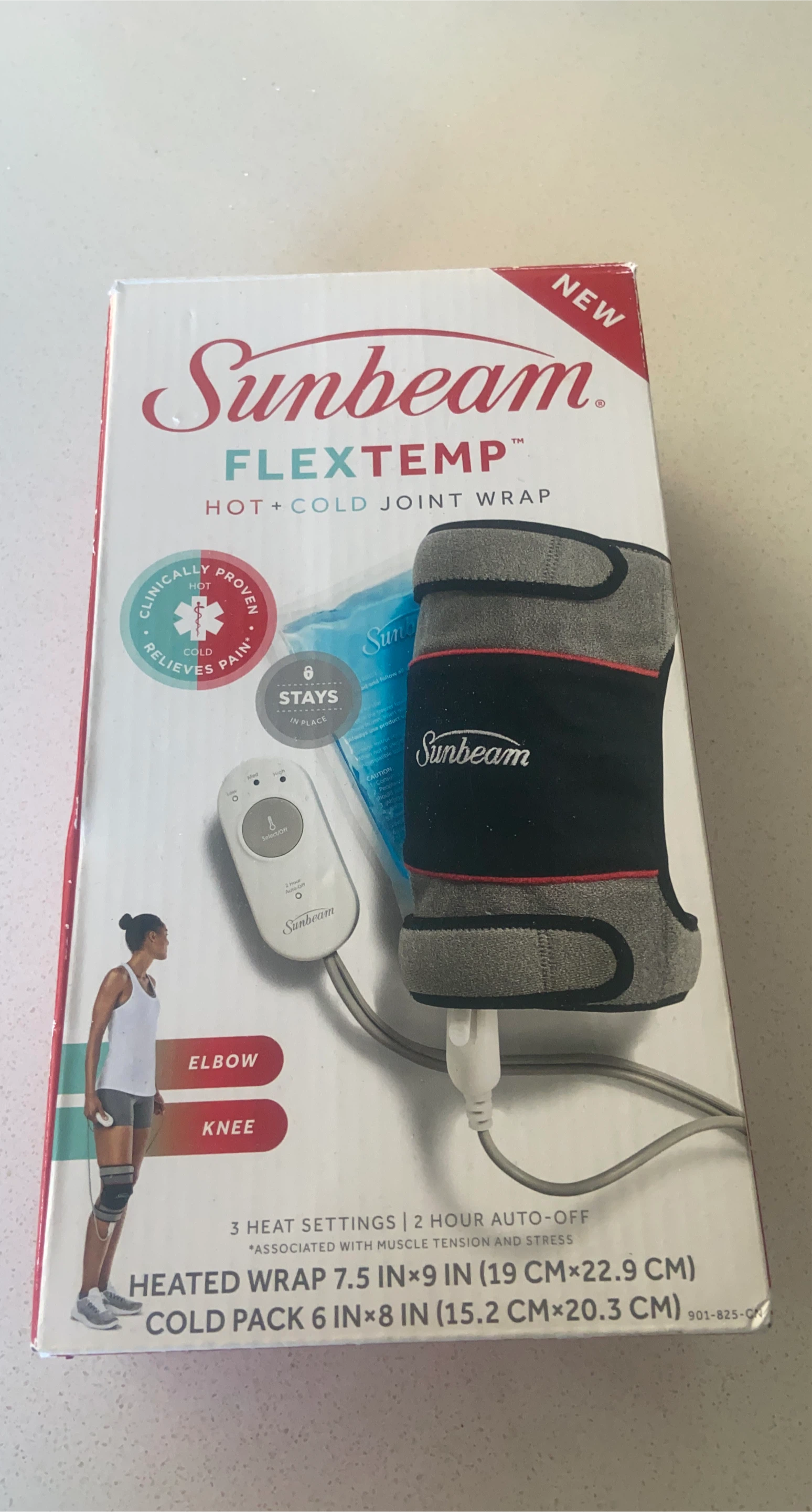 Selling a brand new Sunbeam Flextemp Hot+Cold Joint Wrap! It's designed to help relieve pain with both hot and cold therapy. This wrap is great for elbows and knees. It has 3 heat settings and a 2-hour auto-off feature for safety. The heated wrap measures 7.5 in x 9 in (19 cm x 22.9 cm), and the cold pack is 6 in x 8 in (15.2 cm x 20.3 cm)