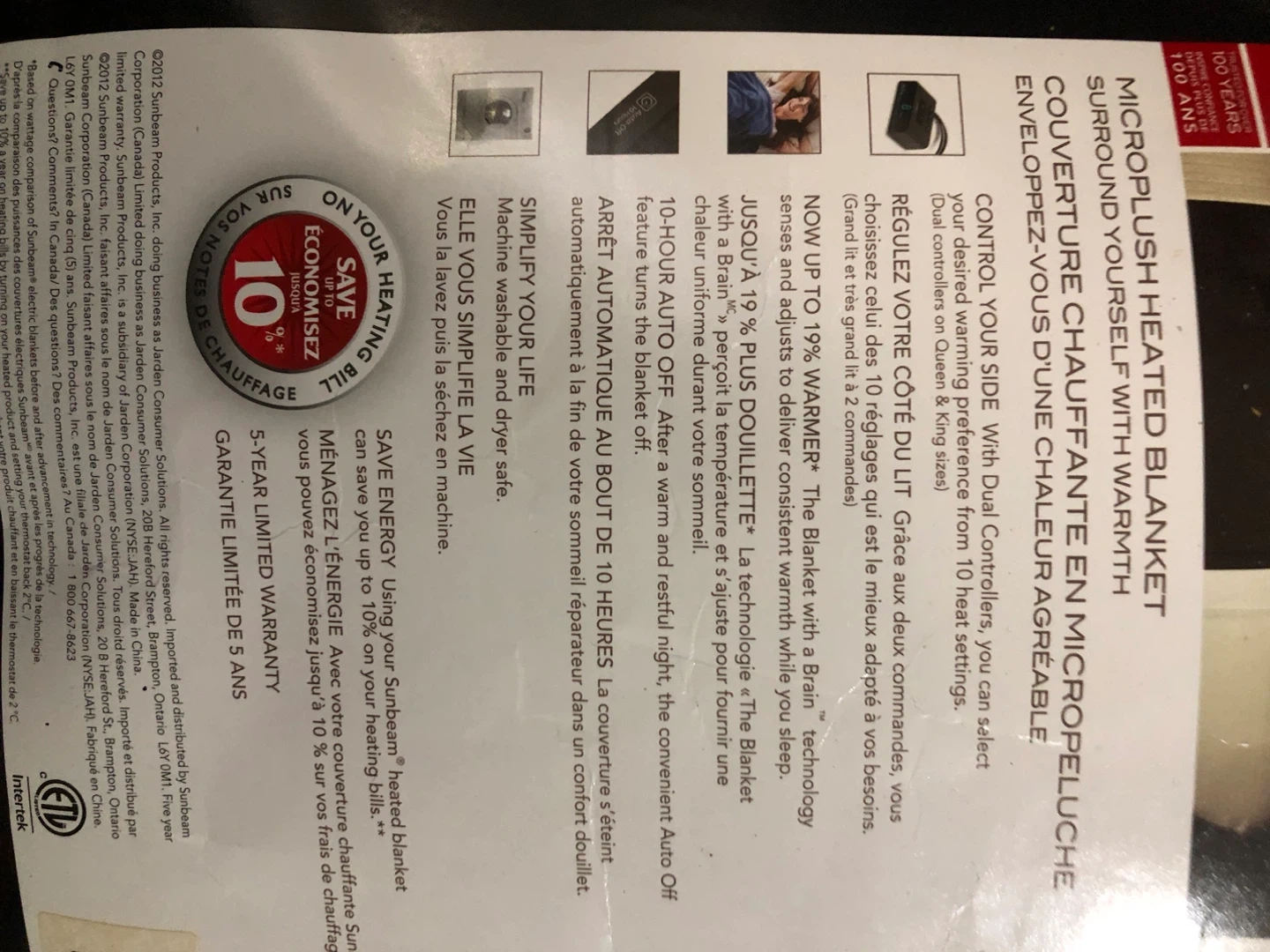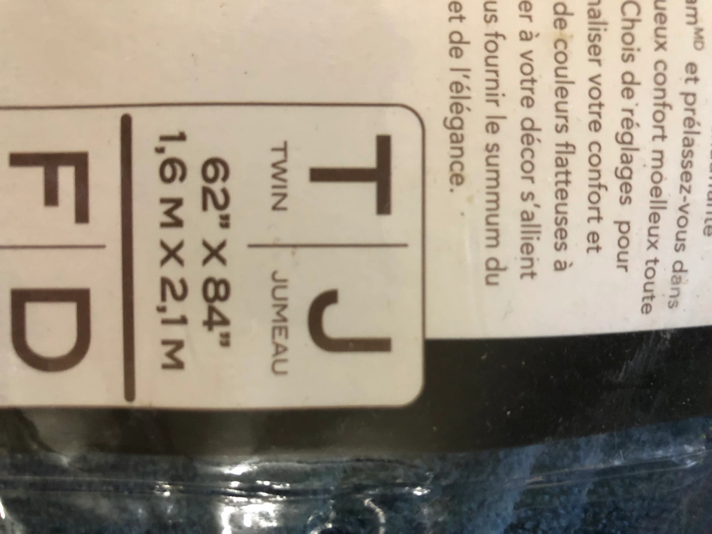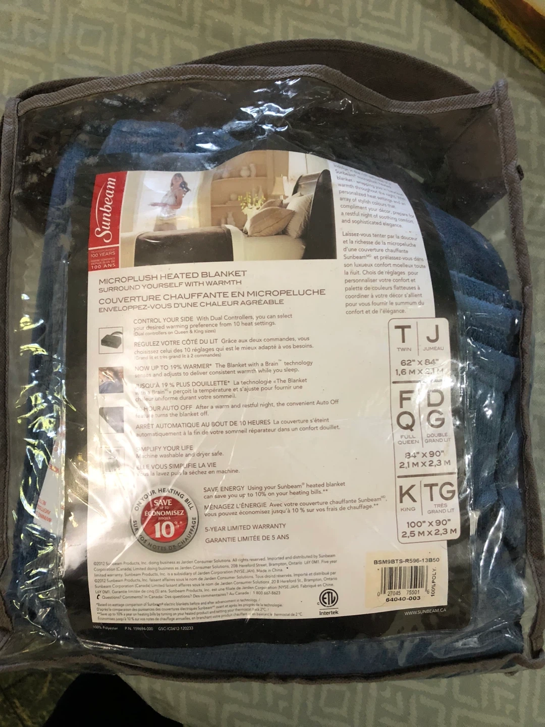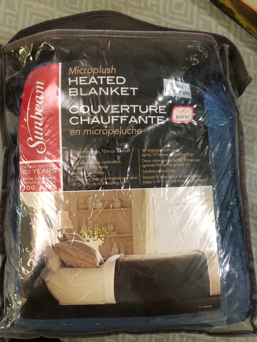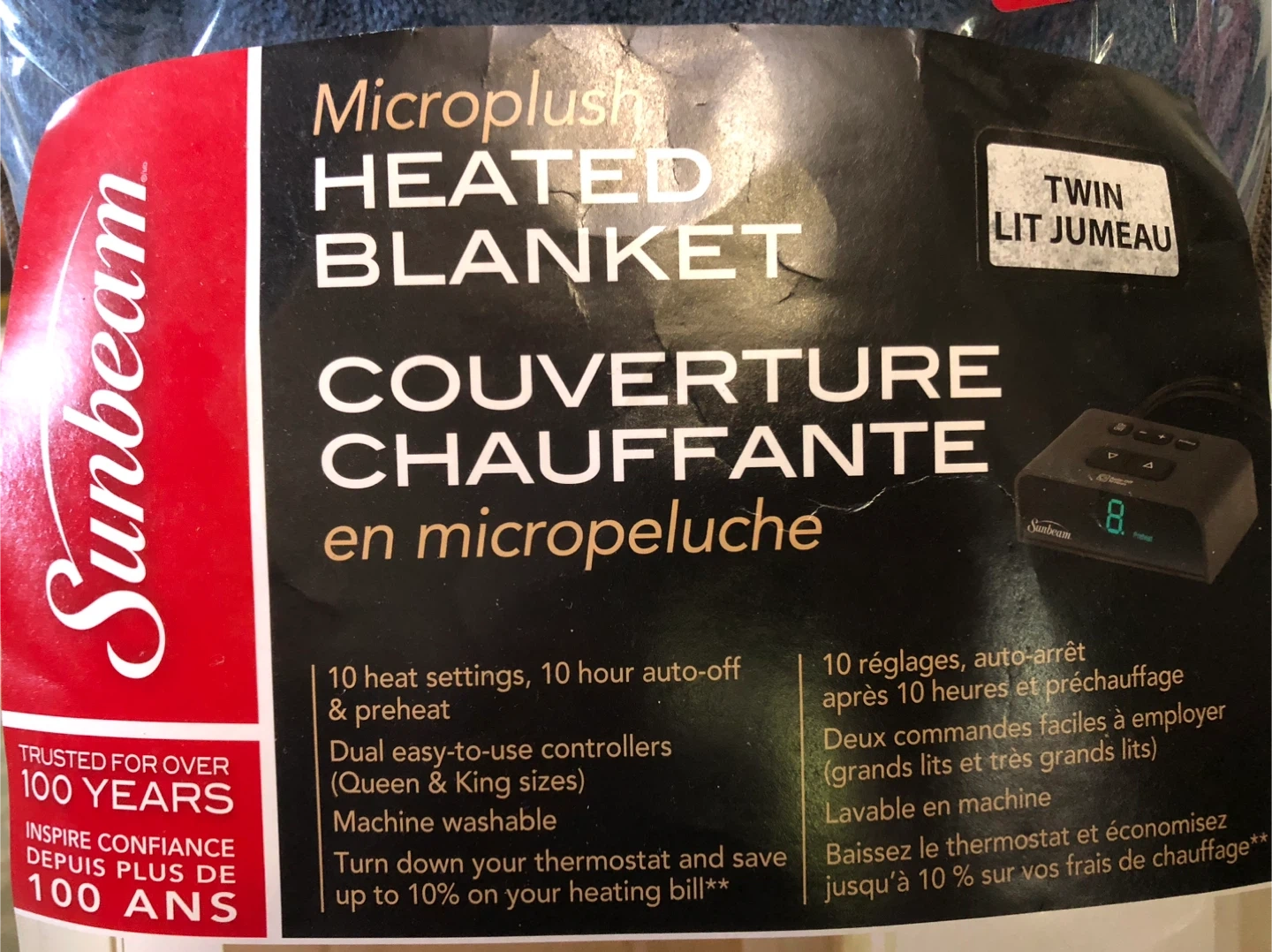 Never opened or taken out of the package Stay warm and cozy with this Sunbeam Microplush Heated Blanket! It's a twin size (62" x 84" or 1.6 m x 2.1 m) It has 10 heat settings and a 10-hour auto-off feature. Originally bought for $134.97. Machine washable for easy care!