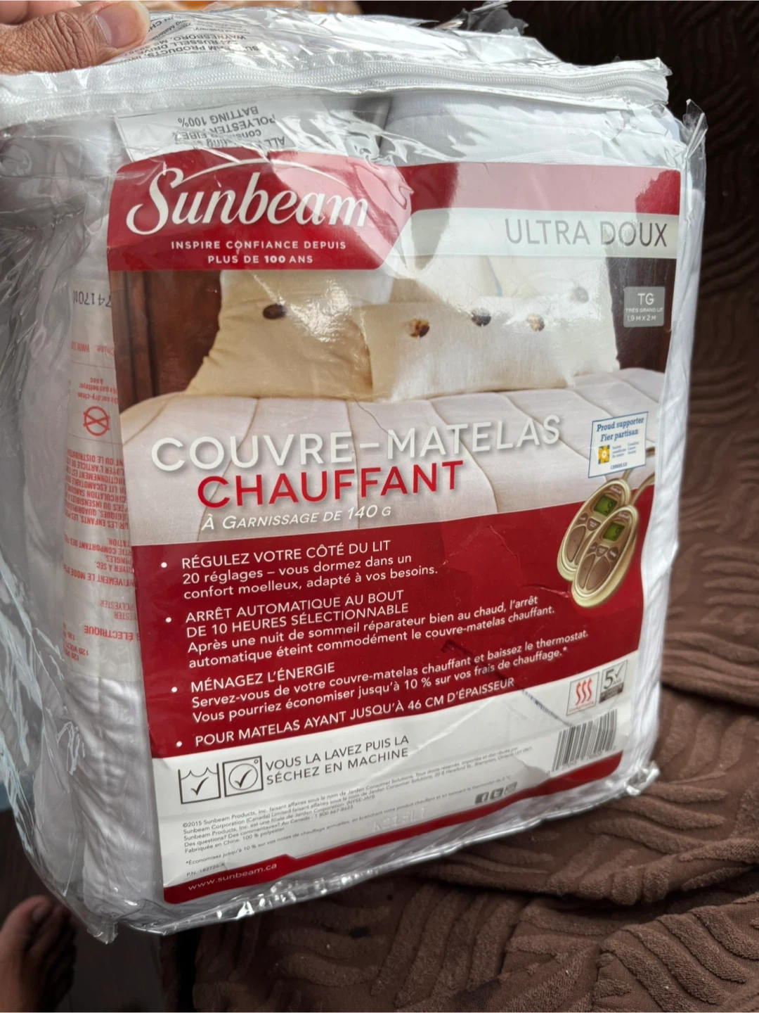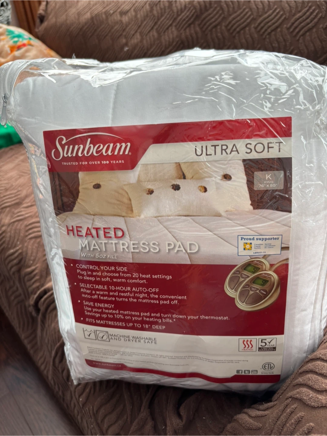 Keep cozy with this Sunbeam Ultra Soft heated mattress pad! It's brand new and still in the original packaging. This king-size pad fits mattresses up to 18" deep and has dual controls, so you and your partner can customize your side. It also has a selectable 10-hour auto-off feature for peace of mind. Machine washable and dryer safe!