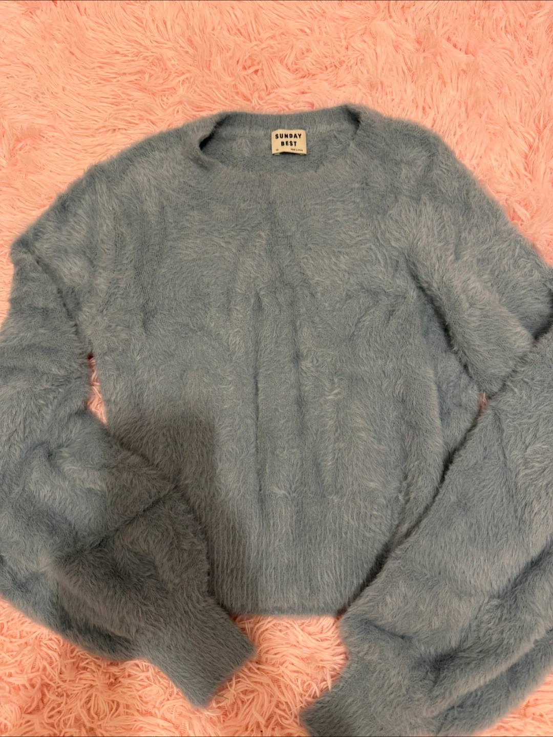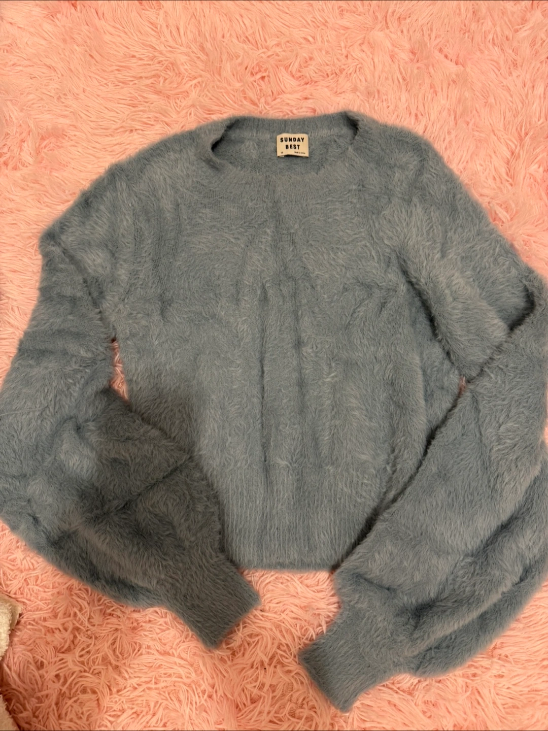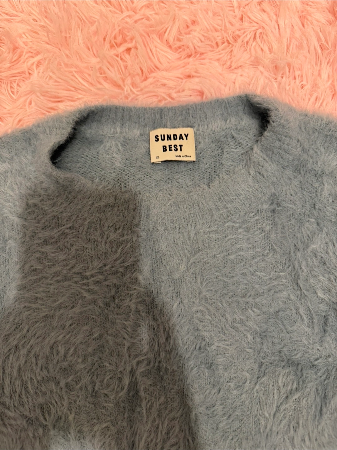 Cozy up in this soft, light blue sweater from Sunday Best by Aritzia. It's a size XS. The fuzzy texture makes it extra comfy for those chilly days