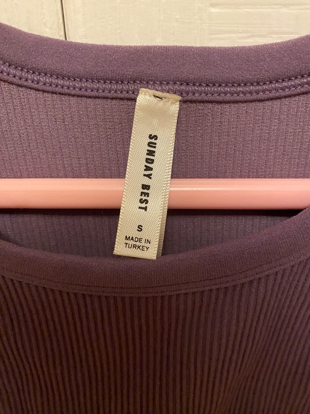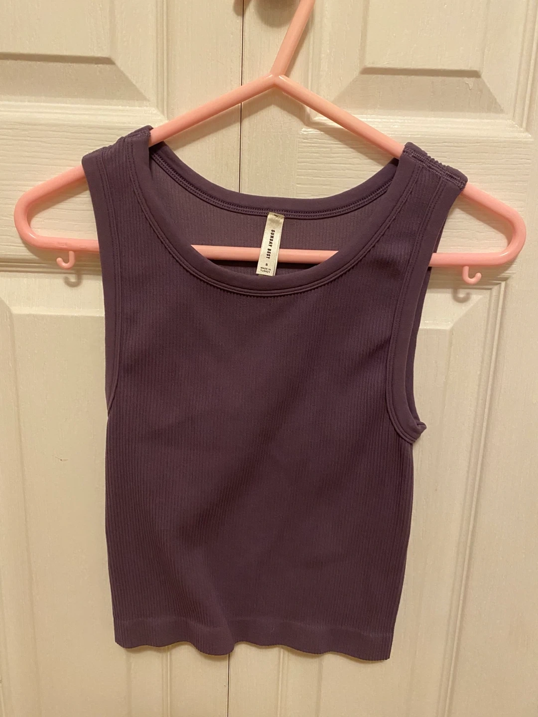 Selling a cute Sunday Best tank top in a lovely purple colour! It's a ribbed material and size small.