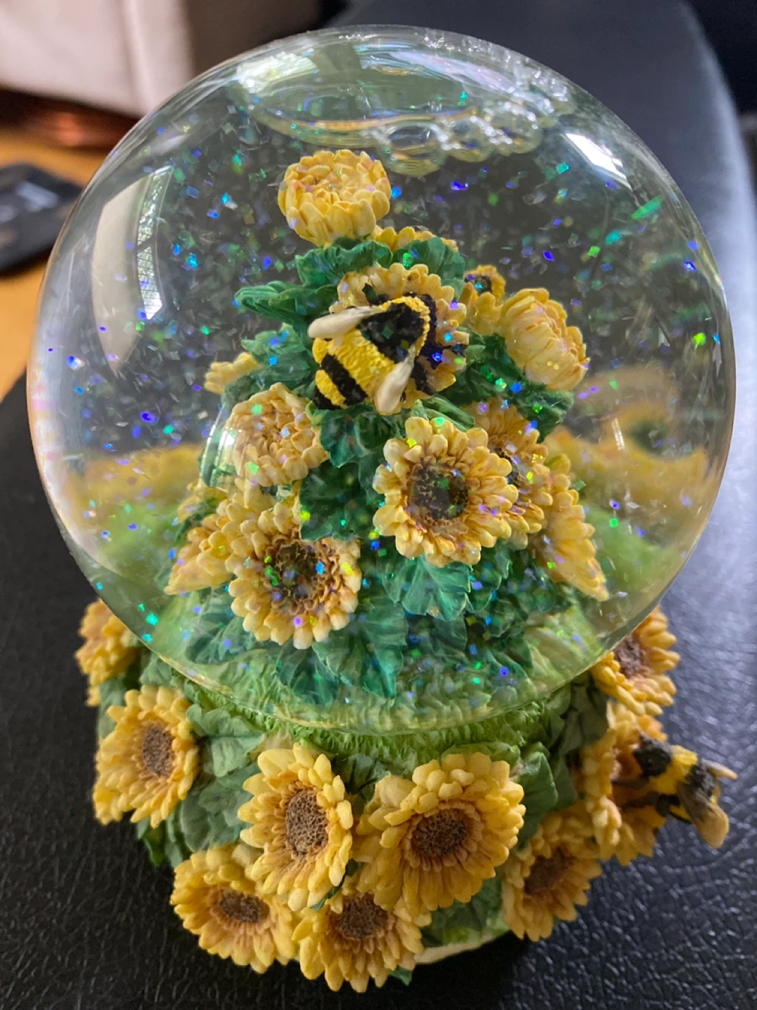 A charming musical snow globe featuring sunflowers and bees! It's in great condition and would make a lovely addition to any collection or a sweet gift for someone special