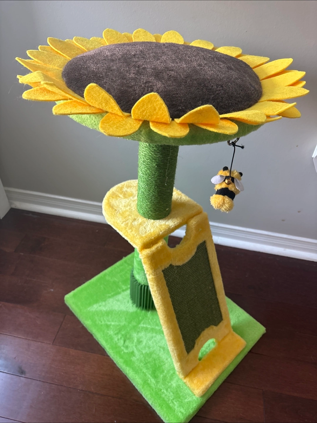 Check out this adorable sunflower-themed cat tree! It features a cozy sunflower-shaped bed on top, a scratching post wrapped in green rope, and a cute little bee toy hanging down. The base is a soft, plush green, and there's even a little step with a scratching surface for your kitty to enjoy. It's in great condition and ready for a new home! My cat showed little to no interest.