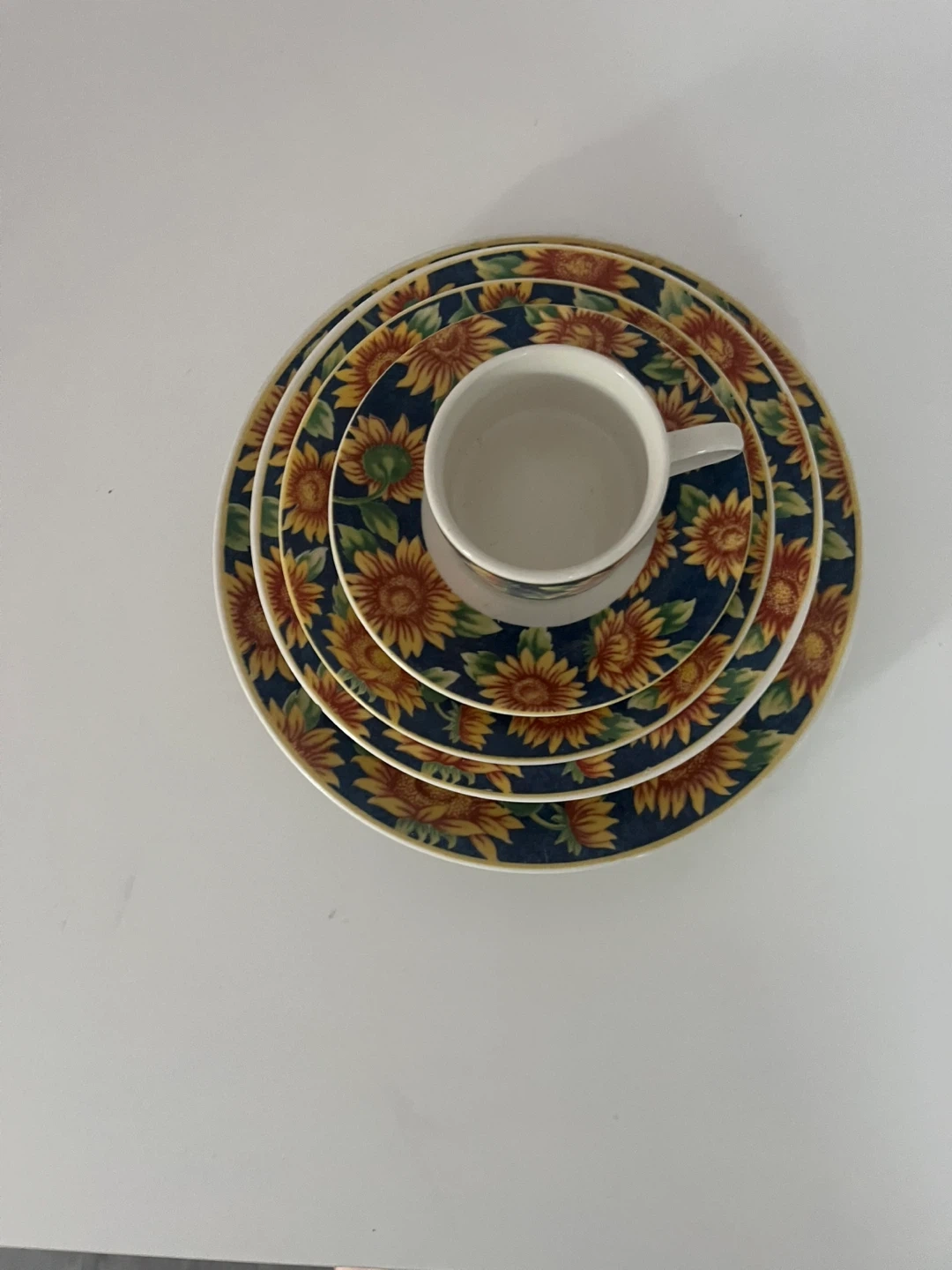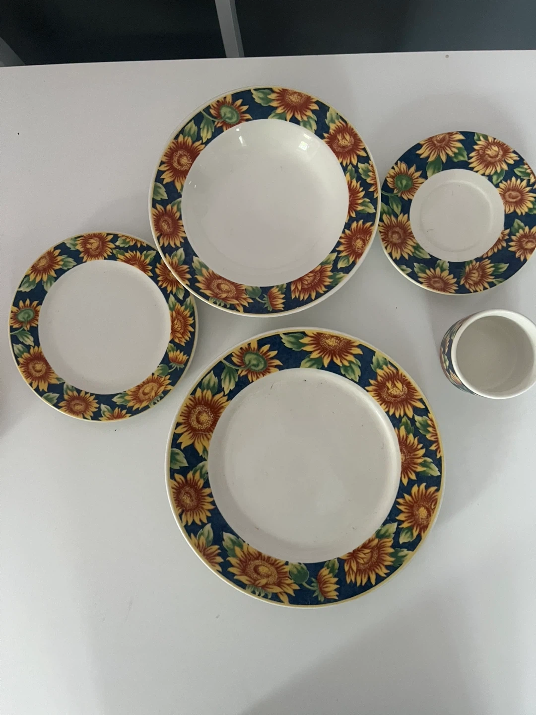 Selling a set of dishes with a cute sunflower pattern. Includes plates, bowls, and a mug. Set of 4, missing 1 mug
