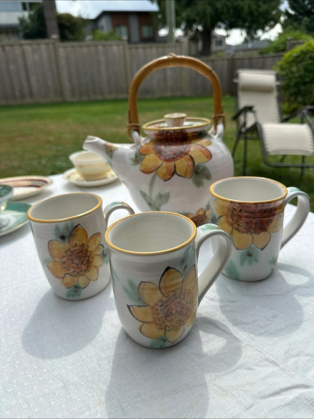 Lovely tea set featuring a sunflower design. Includes a teapot with a bamboo handle and three matching mugs. Perfect for adding a touch of sunshine to your tea time! Pottery handmade by a BC artist. Bought at the Harrison pottery sale. The teapot lid has a crack. Mugs are perfect condition.