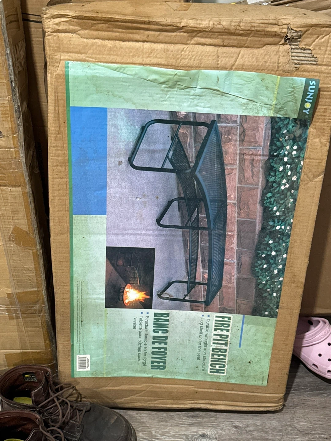 Selling a Sunjoy Fire Pit Bench! It features a durable wrought iron structure and a log shelf under the seat. Perfect for cozy evenings by the fire