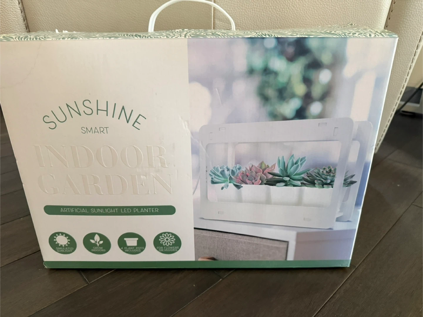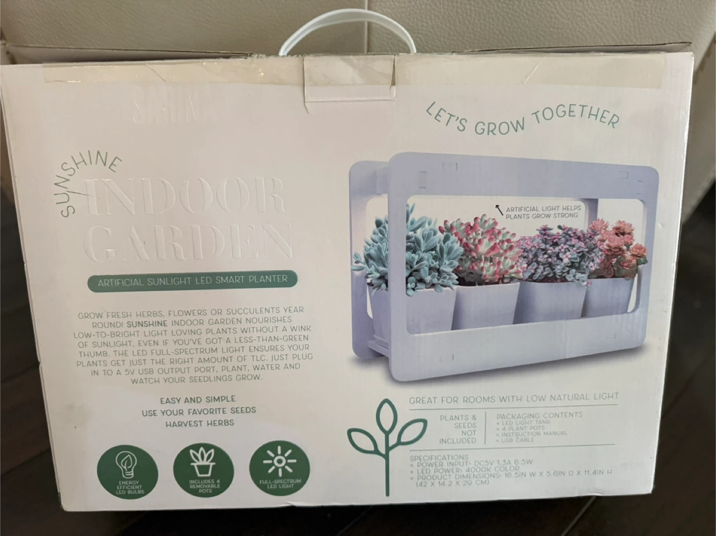 Grow fresh herbs, flowers, or succulents year-round with this Sunshine Smart Indoor Garden! It nourishes low-sunlight-loving plants without a wink of sunlight. The LED full-spectrum light ensures your plants get just the right amount of light. - Artificial sunlight LED planter - Great for low-light areas like an office, restroom, or dorm room - Easy and simple to use your favourite seeds and harvest herbs - Includes 4 plant pots and a user manual