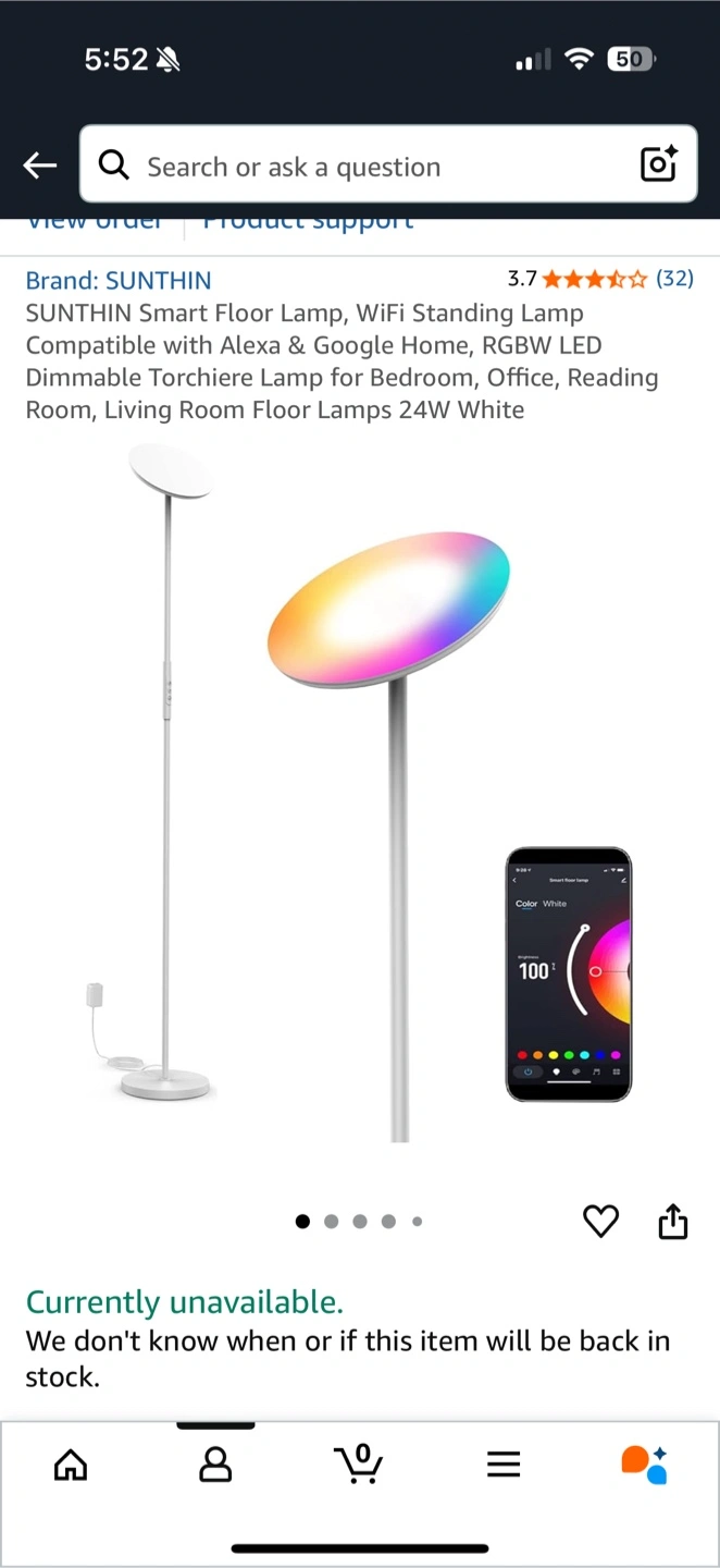 Selling a SUNTHIN Smart Floor Lamp, a WiFi standing lamp that's compatible with Alexa & Google Home. It features RGBW LED dimmable torchiere lighting, perfect for your bedroom, office, reading room, or living room. The lamp is 24W and white. Originally, it was $69