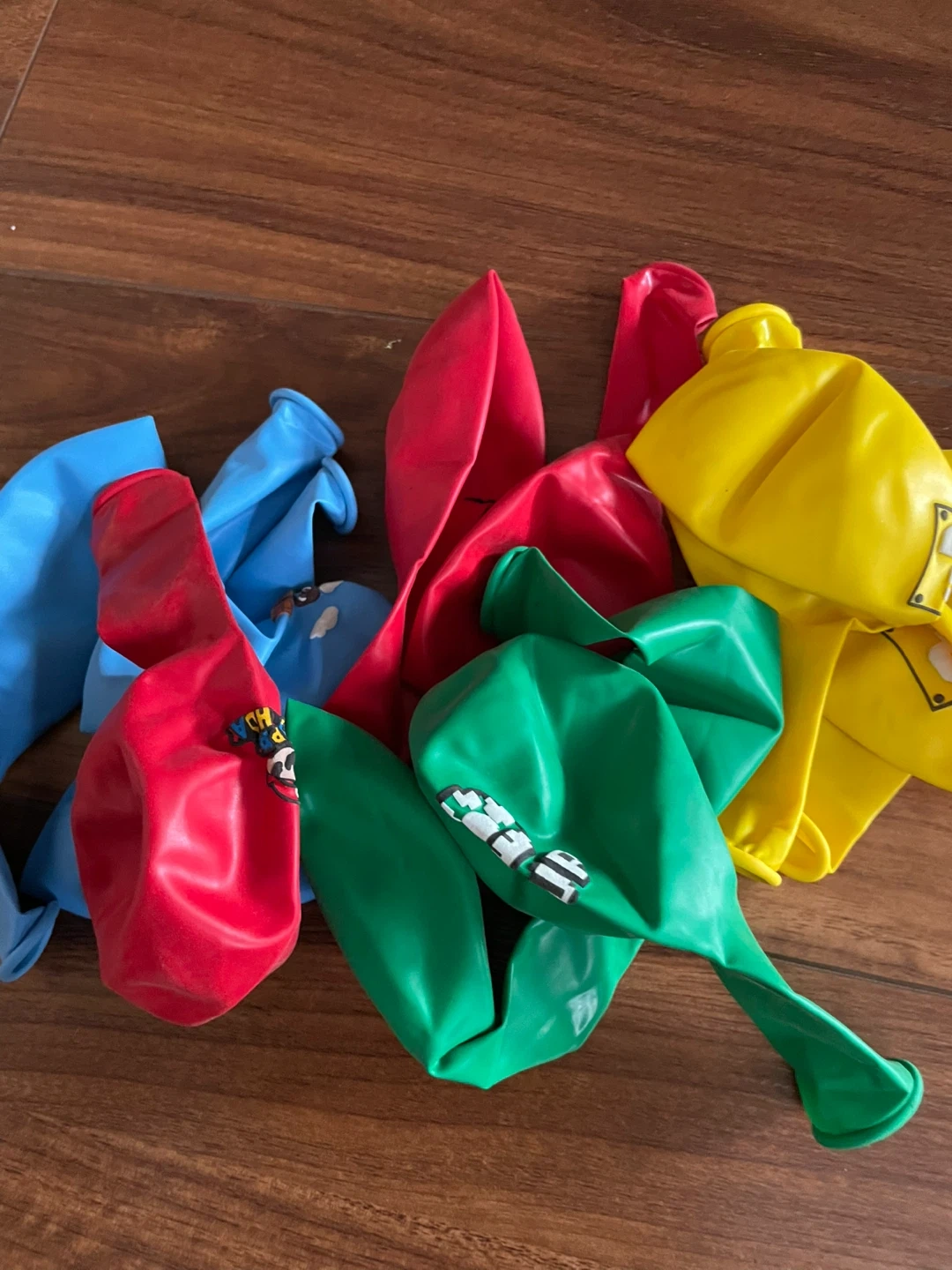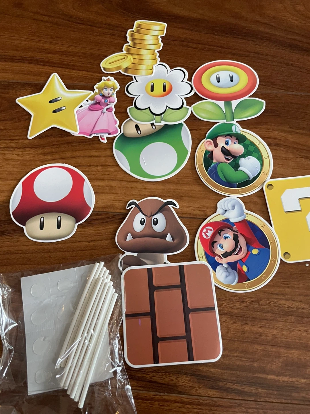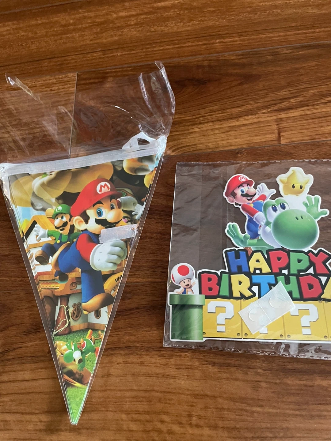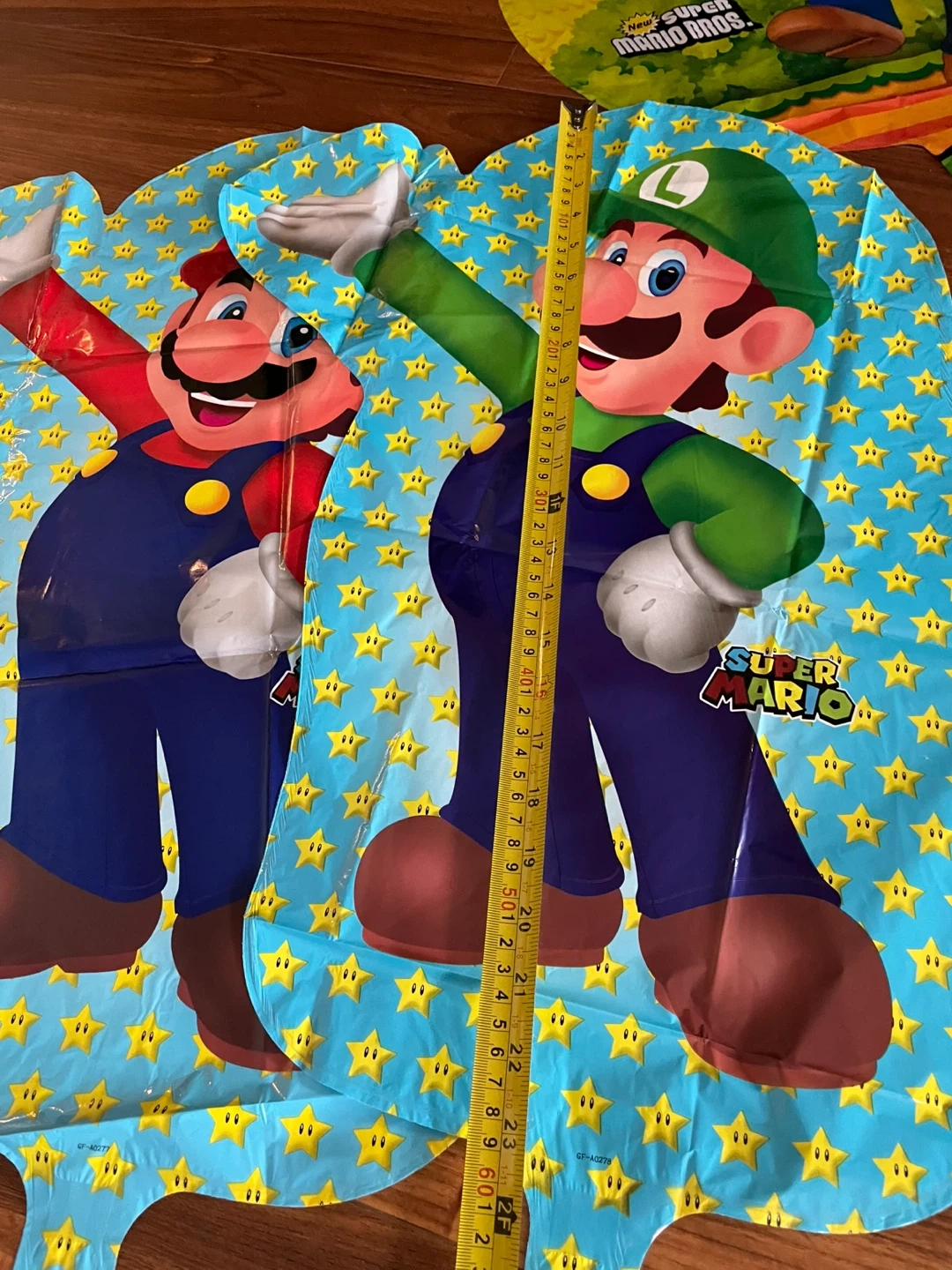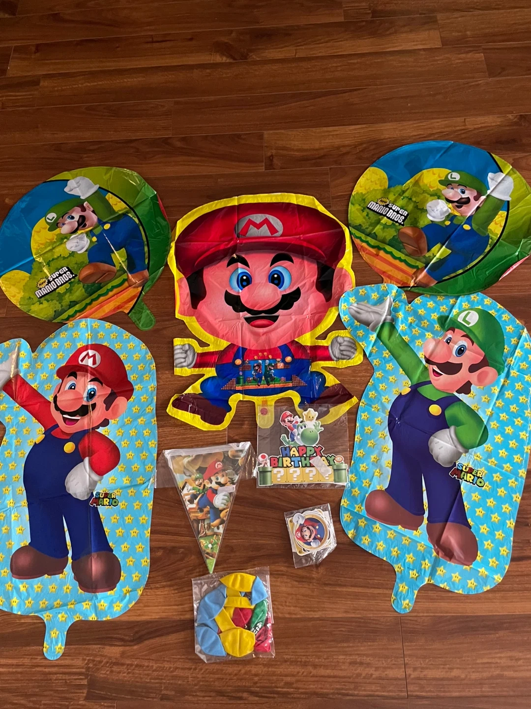 Selling a set of Super Mario Bros themed party balloons and decorations! The Mario and Luigi foil balloons, cupcake toppers, banner, printed balloons m. Perfect for a birthday party or any Super Mario fan. On first come basis.