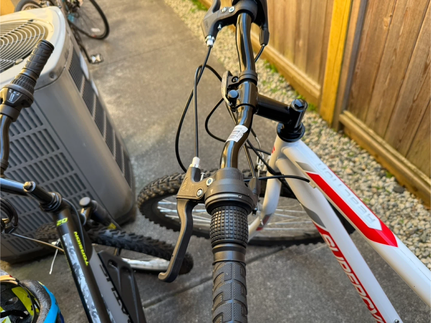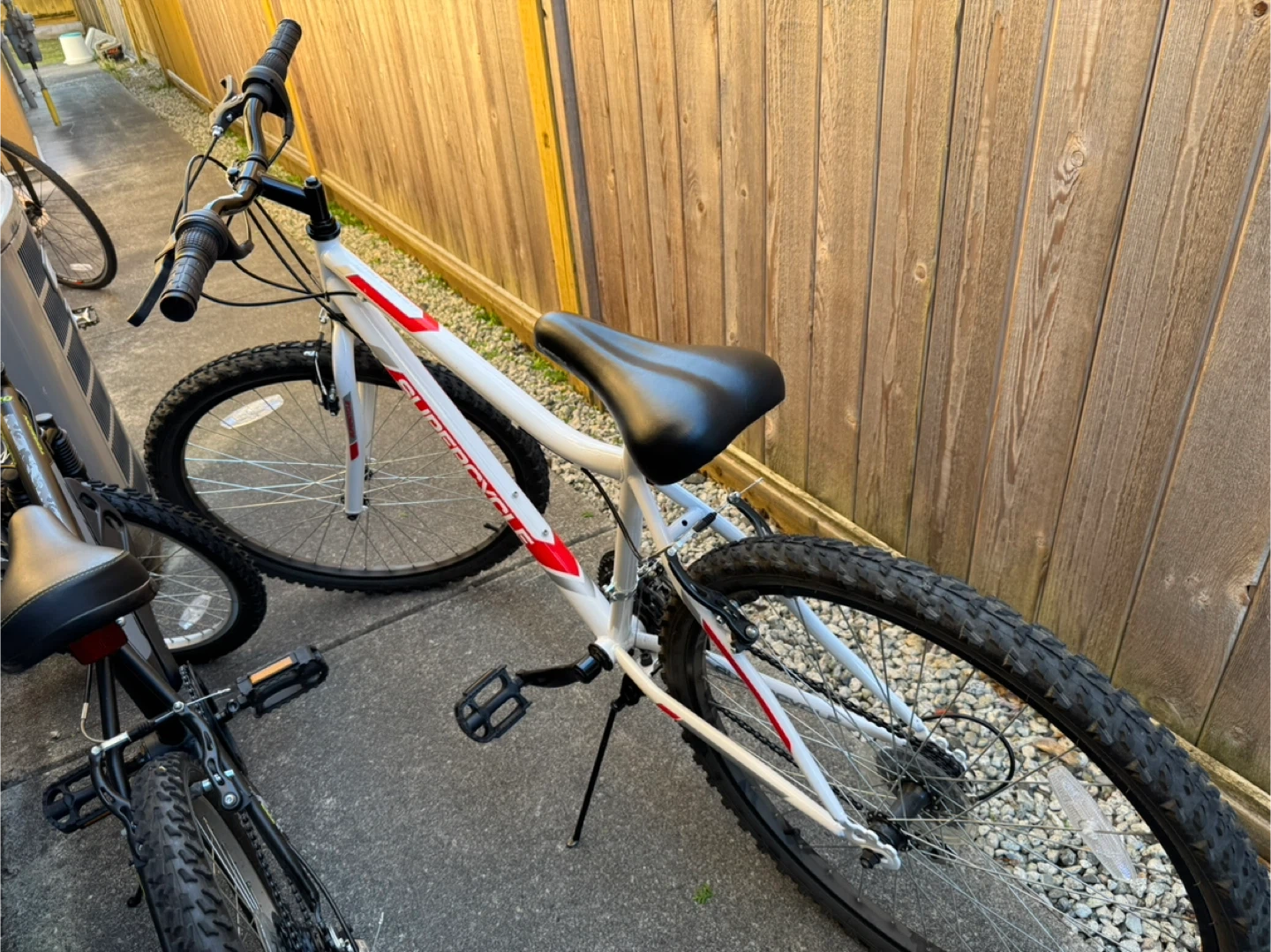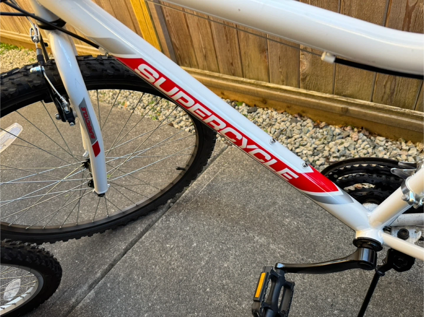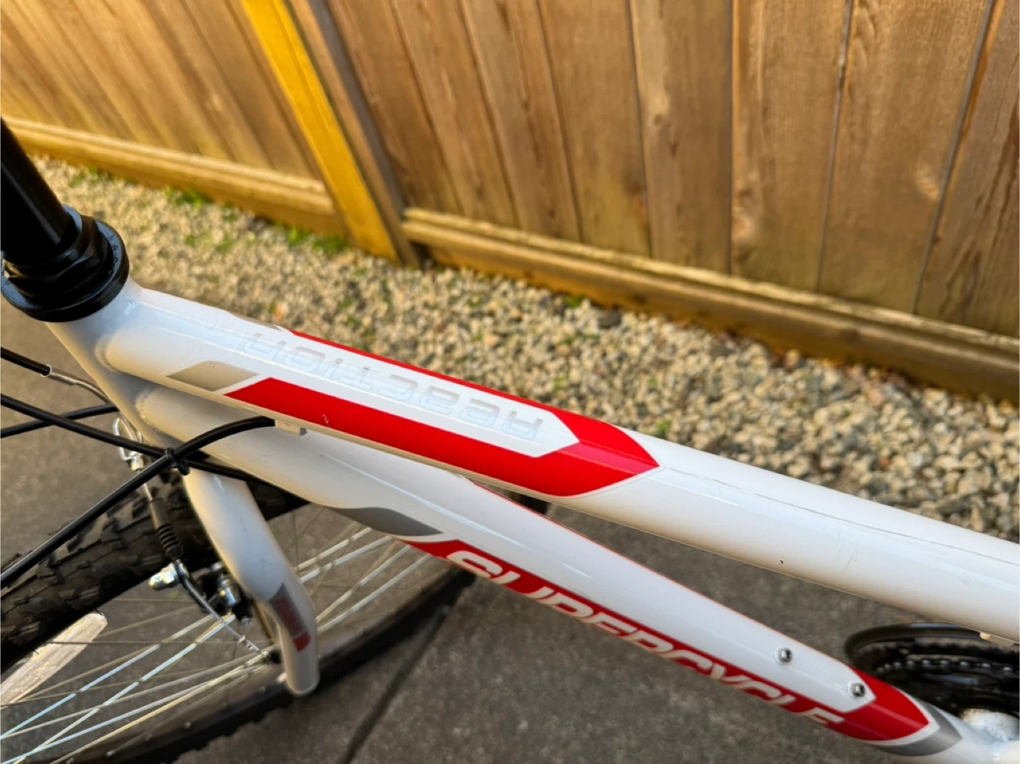 Selling a Supercycle Reaction bike in white and red. It's in good condition and ready for some new adventures! The bike has a sturdy frame and would be great for recreational rides around the neighbourhood or on trails