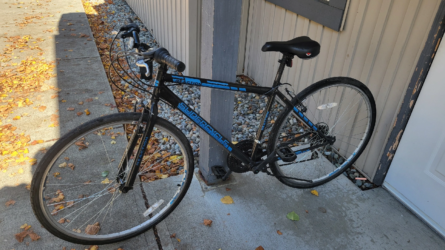 Selling a Supercycle Reaction hybrid bike. It's black with blue accents. Great for commuting or recreational rides around town