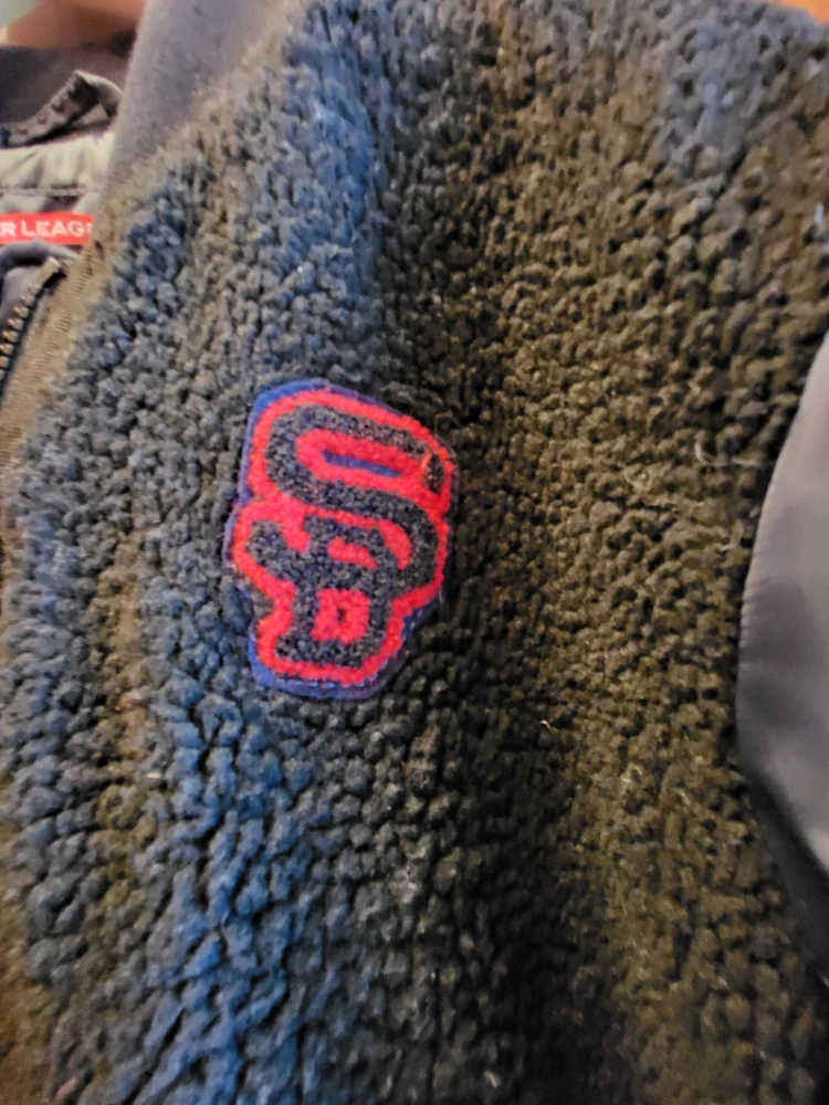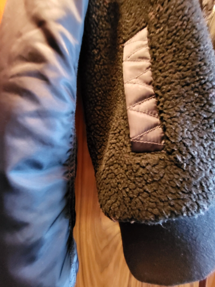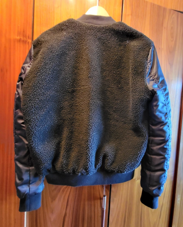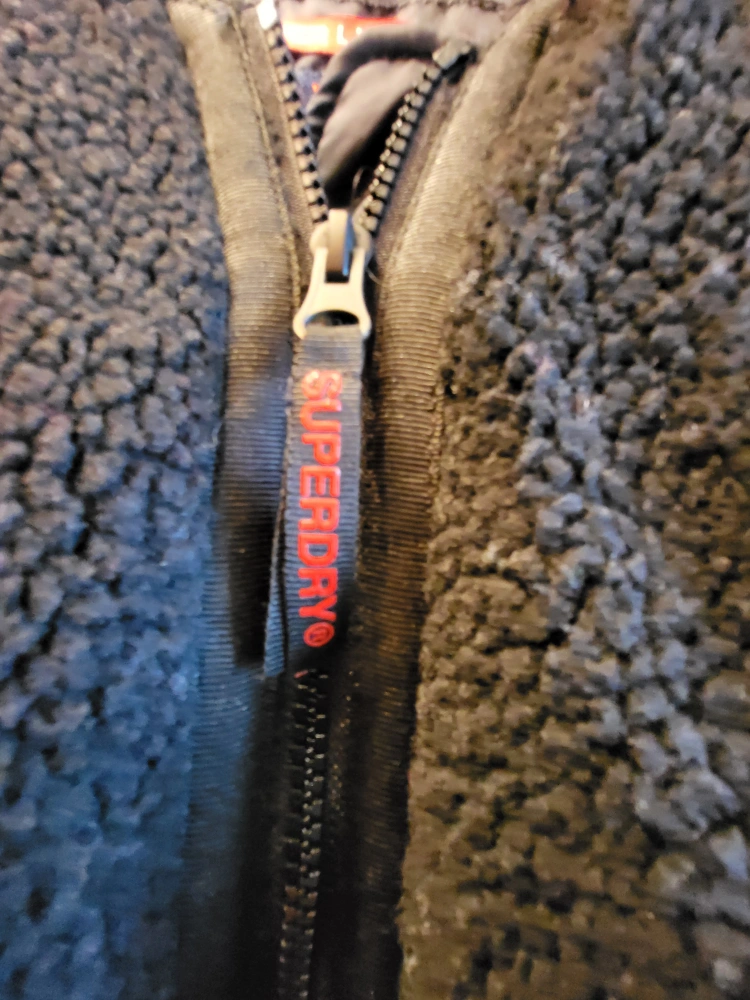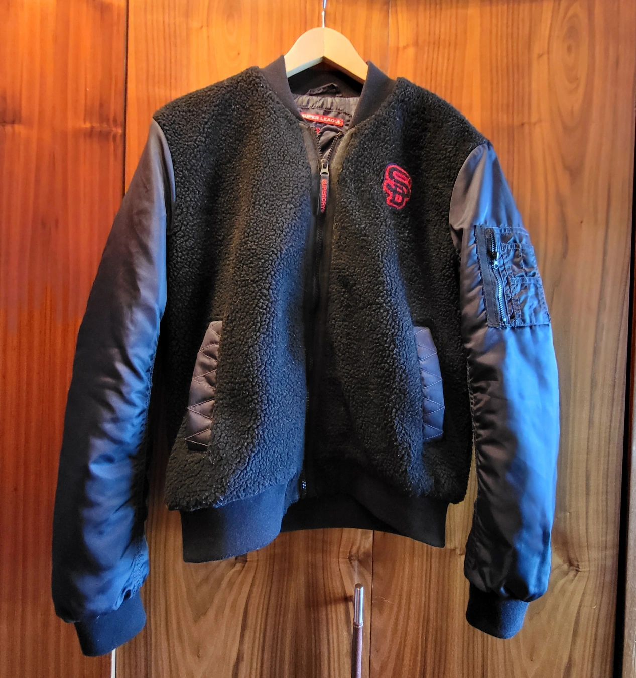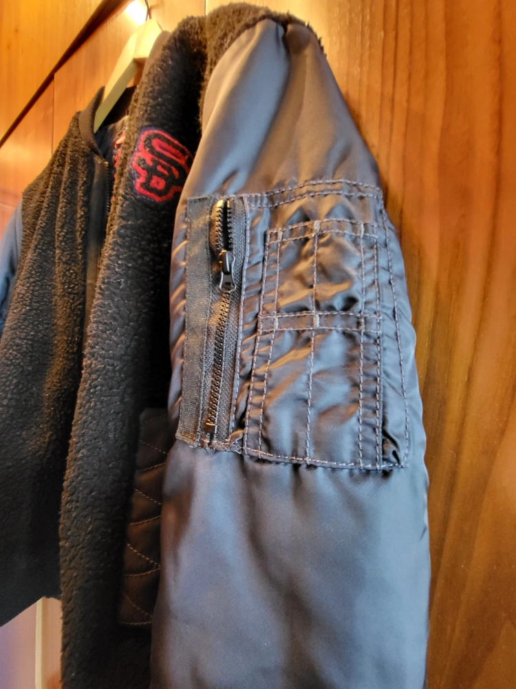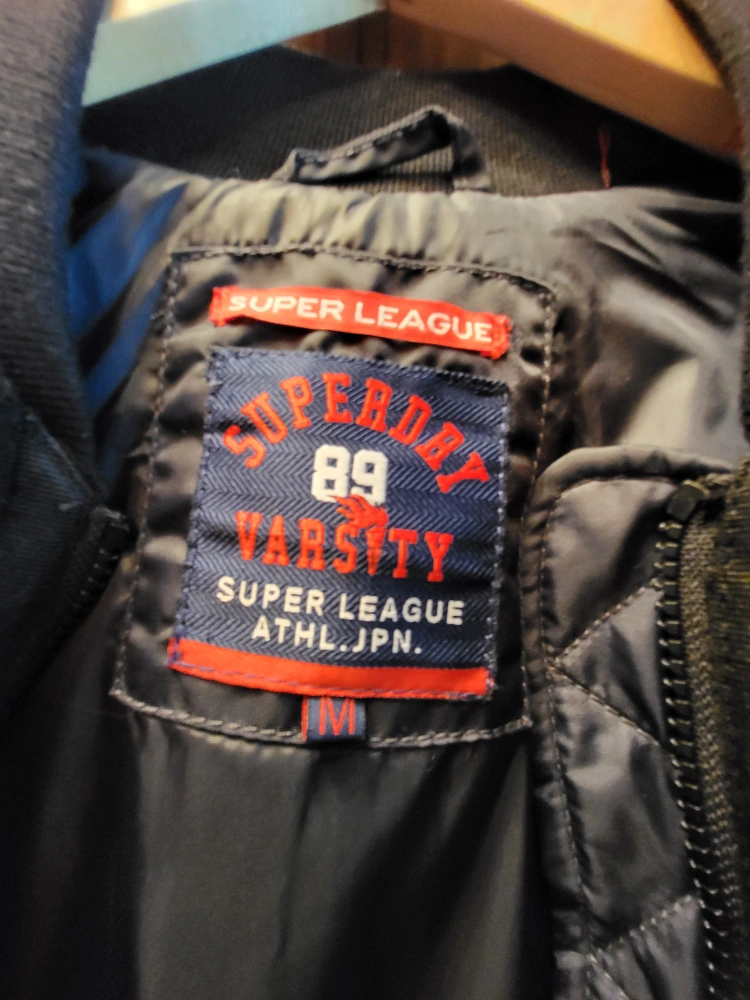Black Superdry 89 Varsity Jacket with a black fleece body and dark navy blue sleeves, size M women's and gender neutral. The jacket has a pocket on the left sleeve and the Superdry logo is featured on the left. Zipper closure and a ribbed collar. Inside left pocket with button closure. The coat is in excellent condition, worn once. No marks or damage. Smoke free, pet free home. Pick up at College and Shaw. Check out my other listings that might be of interest.