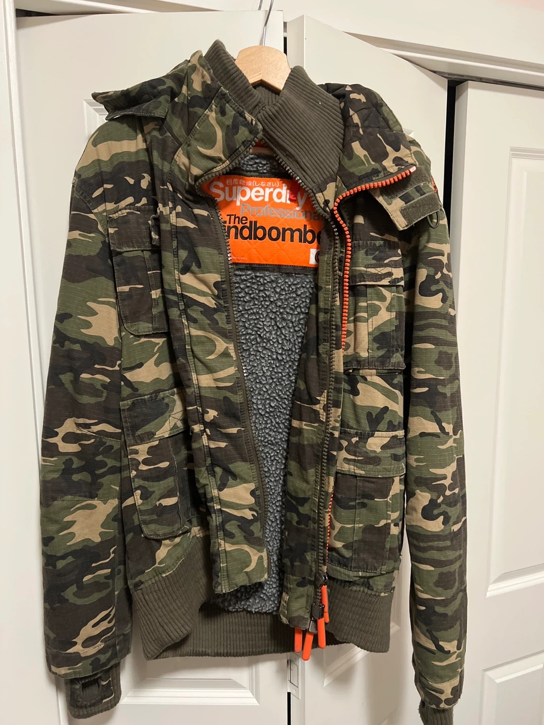 Selling a Superdry bomber jacket in a camo print. It's in great condition and features a cozy lining. Perfect for staying warm and stylish!
