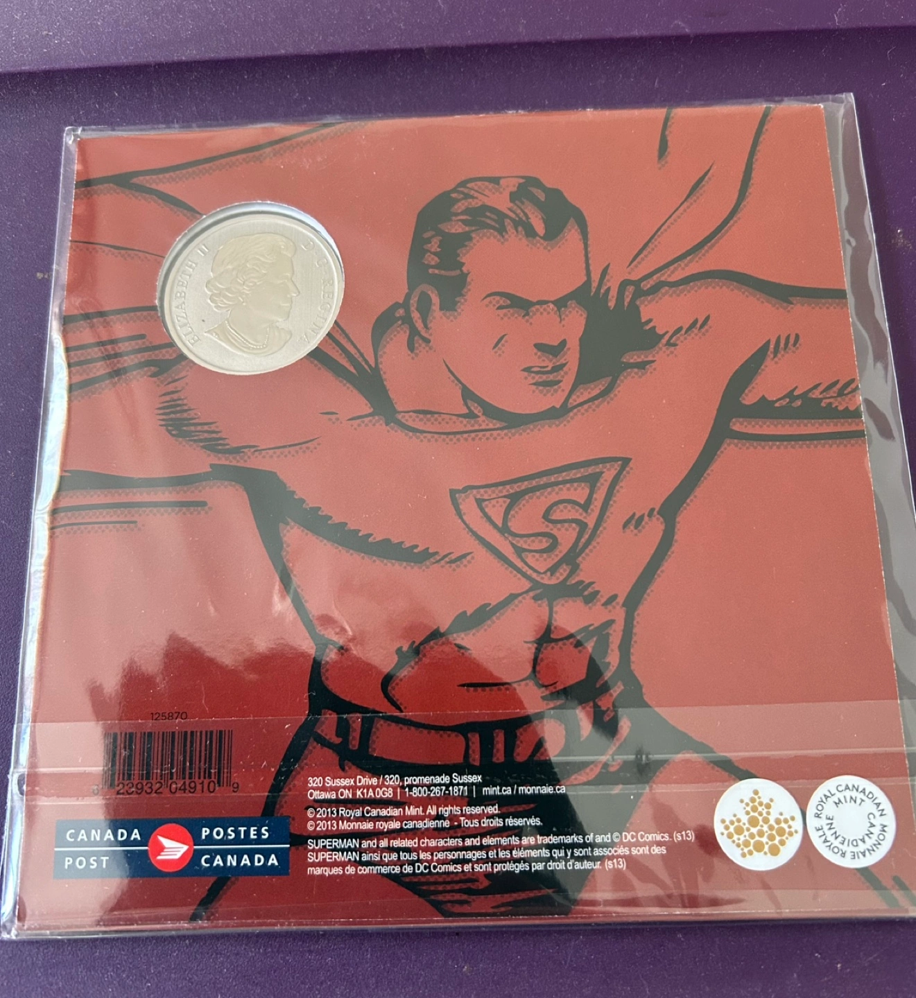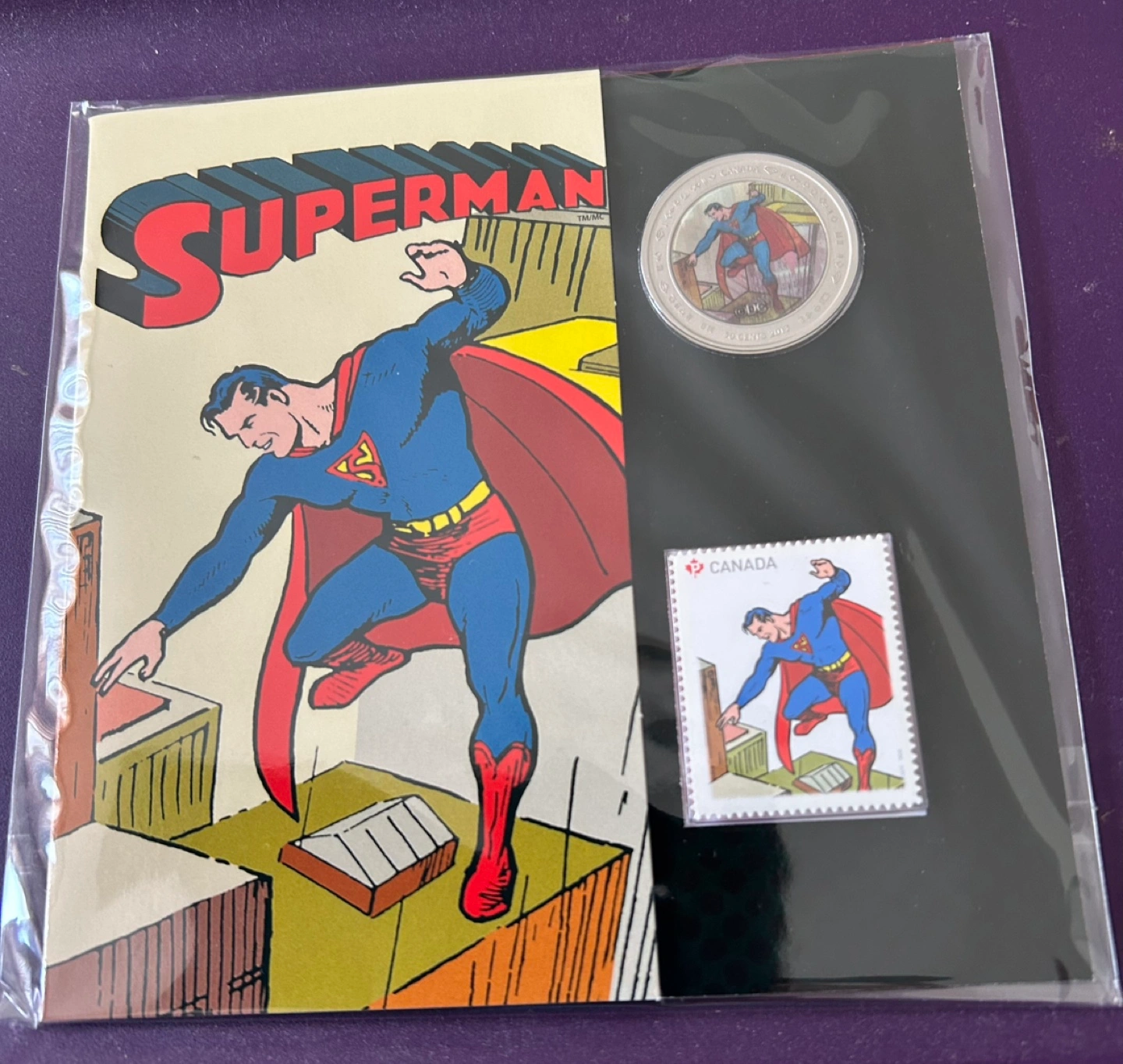 Collectible Superman coin and stamp set. Features a commemorative coin and postage stamp. Packaged in a protective sleeve. Great for collectors.