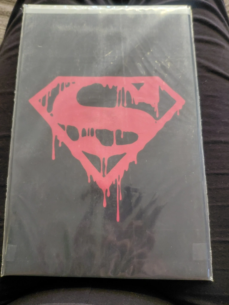 Selling a Superman comic book. It features the Superman logo in red on a black background. The comic is in a protective plastic sleeve. has never been taken out of the plastic sleeve