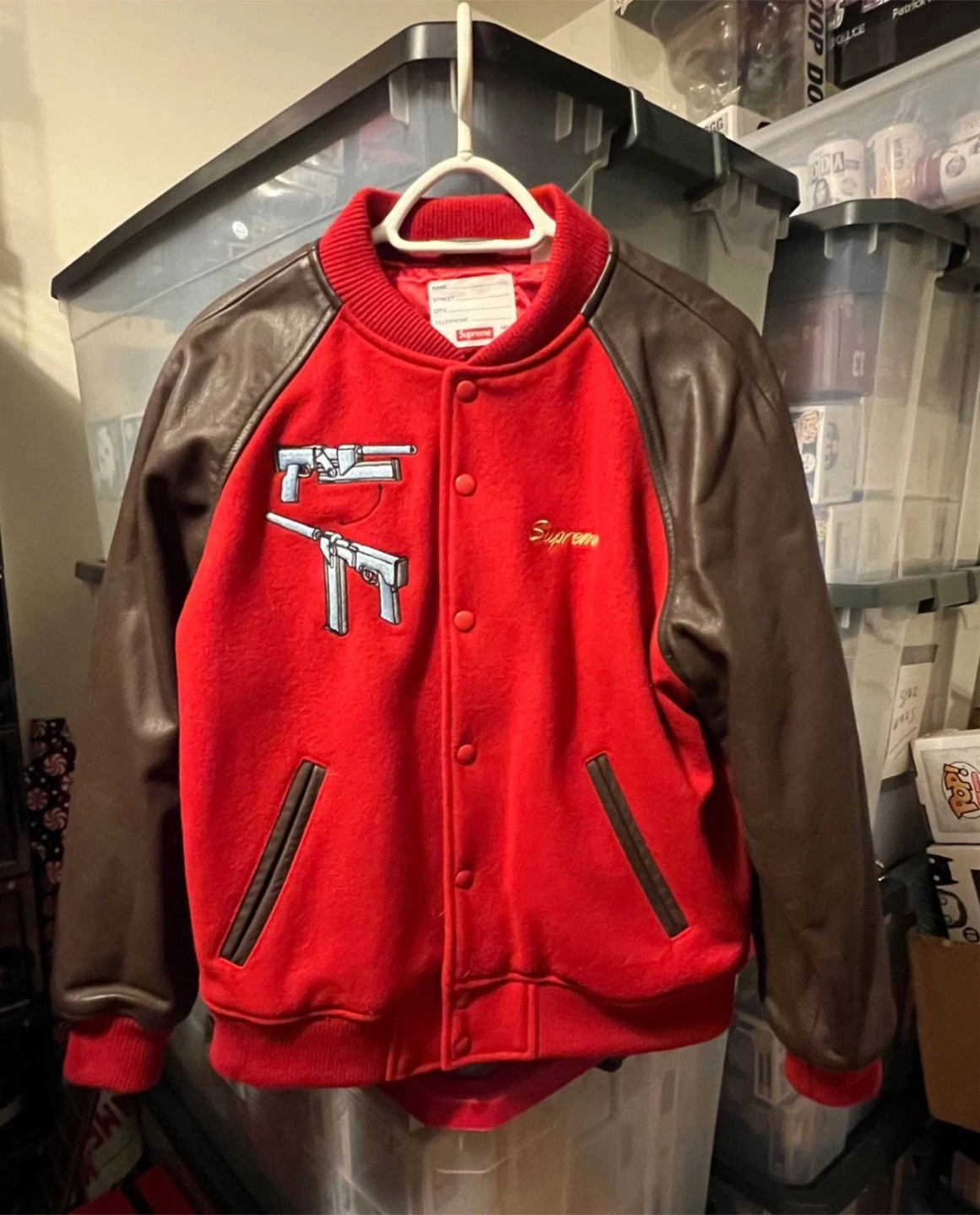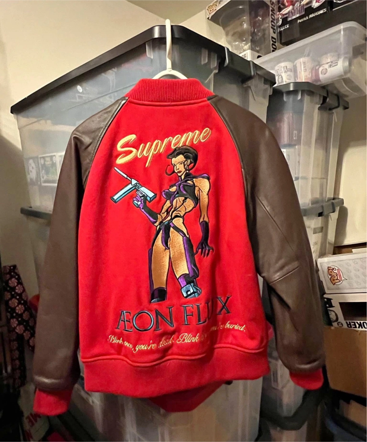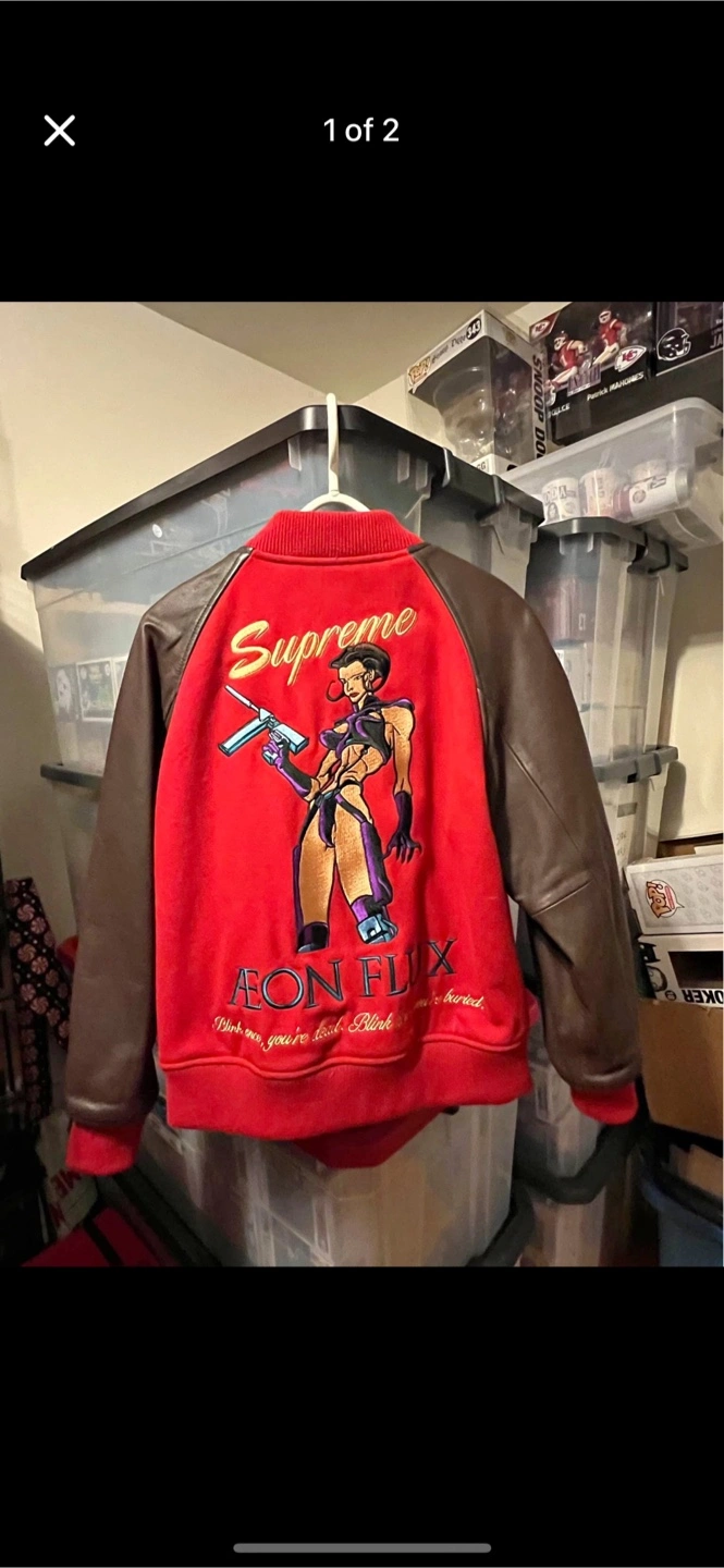 Red wool varsity jacket. Brown leather sleeves. Embroidered Aeon Flux graphic on the back. Supreme logo on the front. Size and condition not specified.