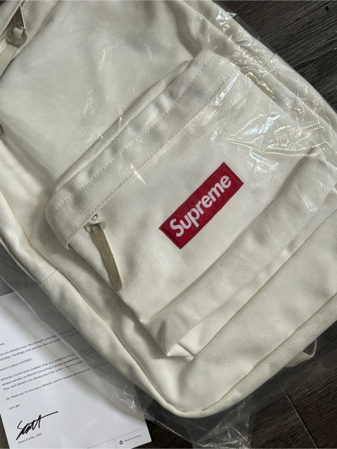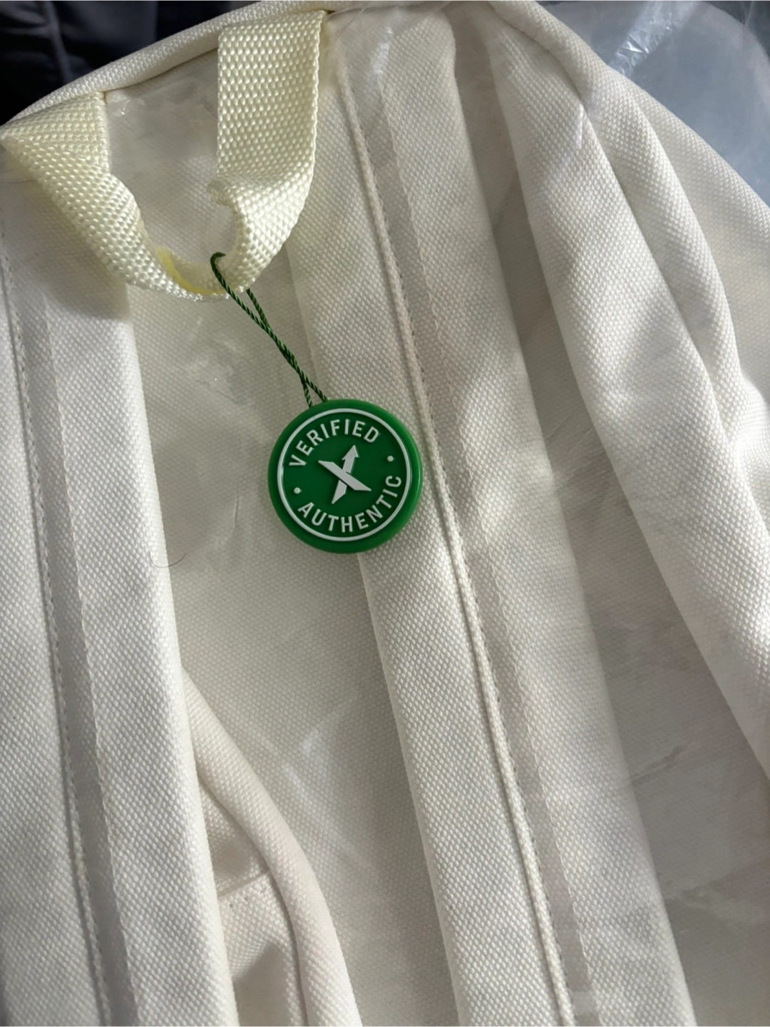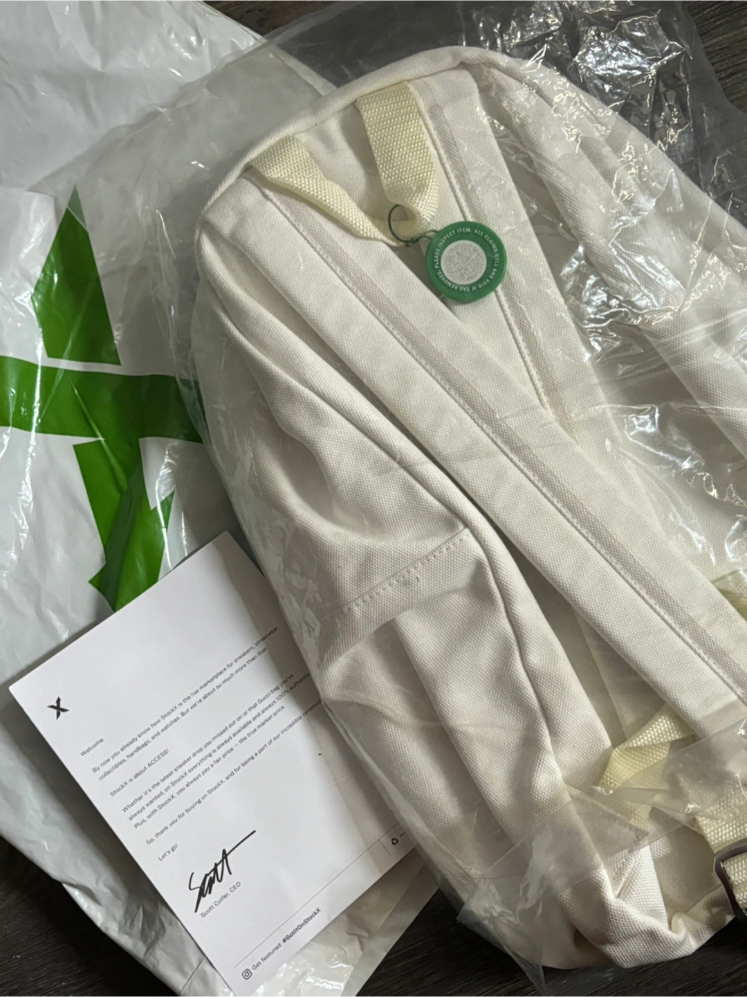 A white backpack, appears new with tags. Zippered pockets and straps. Would be great for school or travel.