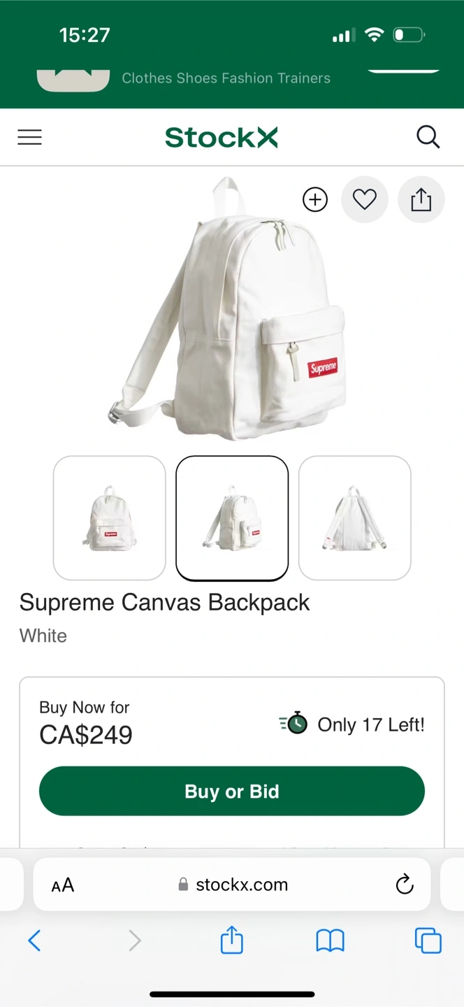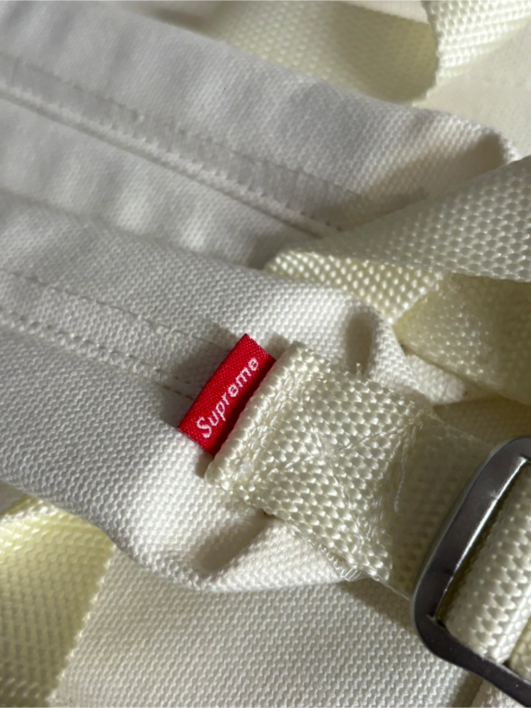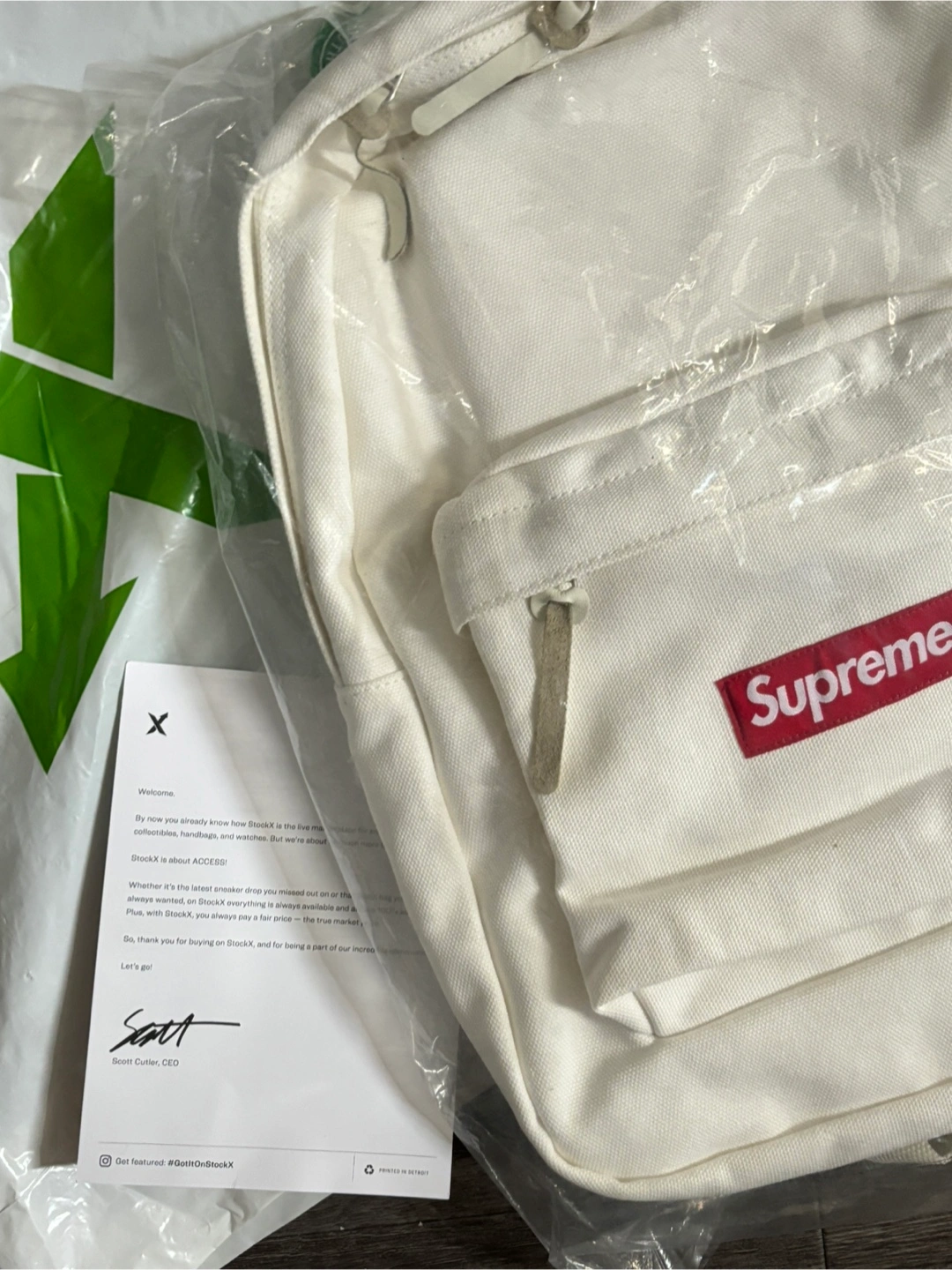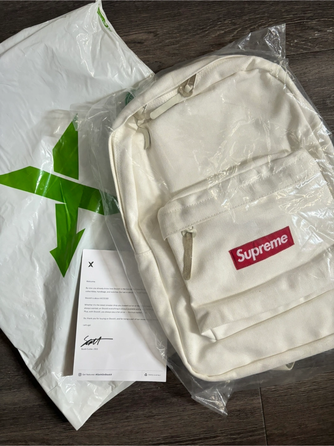 A white backpack, appears new with tags. Zippered pockets and straps. Would be great for school or travel.