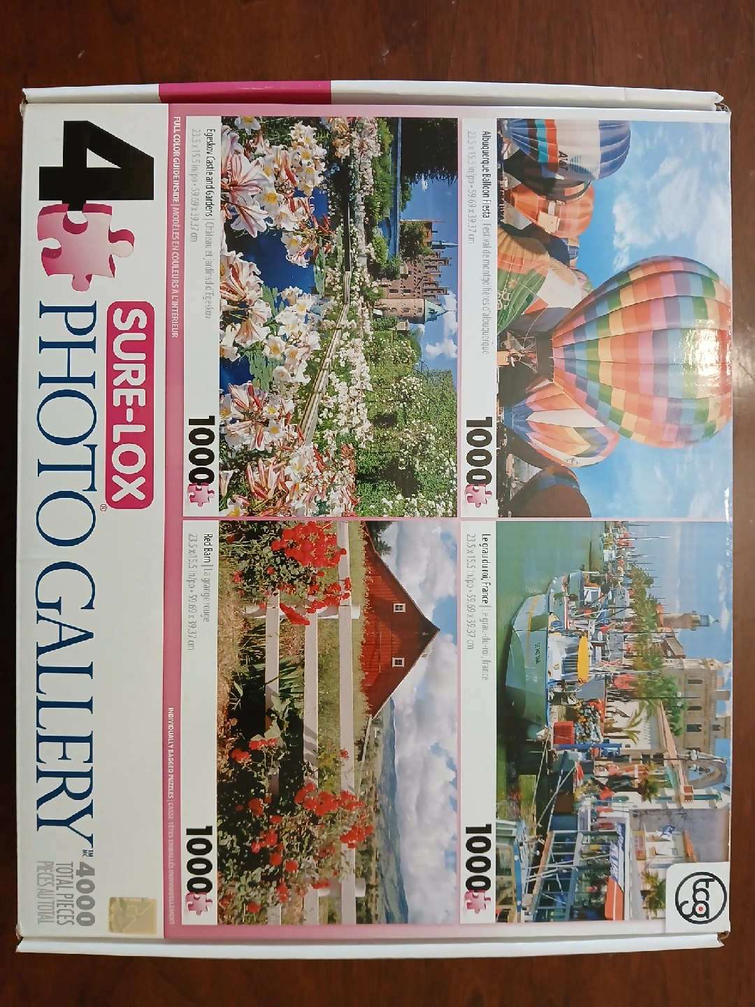 Selling a Sure-Lox 4-in-1 Photo Gallery puzzle with a total of 4000 pieces! It features four different 1000-piece puzzles in one box. Each puzzle showcases a unique photo gallery theme, including: - Albuquerque Balloon Fiesta - Egeskov Castle and Gardens - Le grau du roi, France - Red Barn Each puzzle measures 23.5 x 15.5 inches (59.69 x 39.37 cm). The box includes a full-colour guide inside, and the puzzles are individually bagged